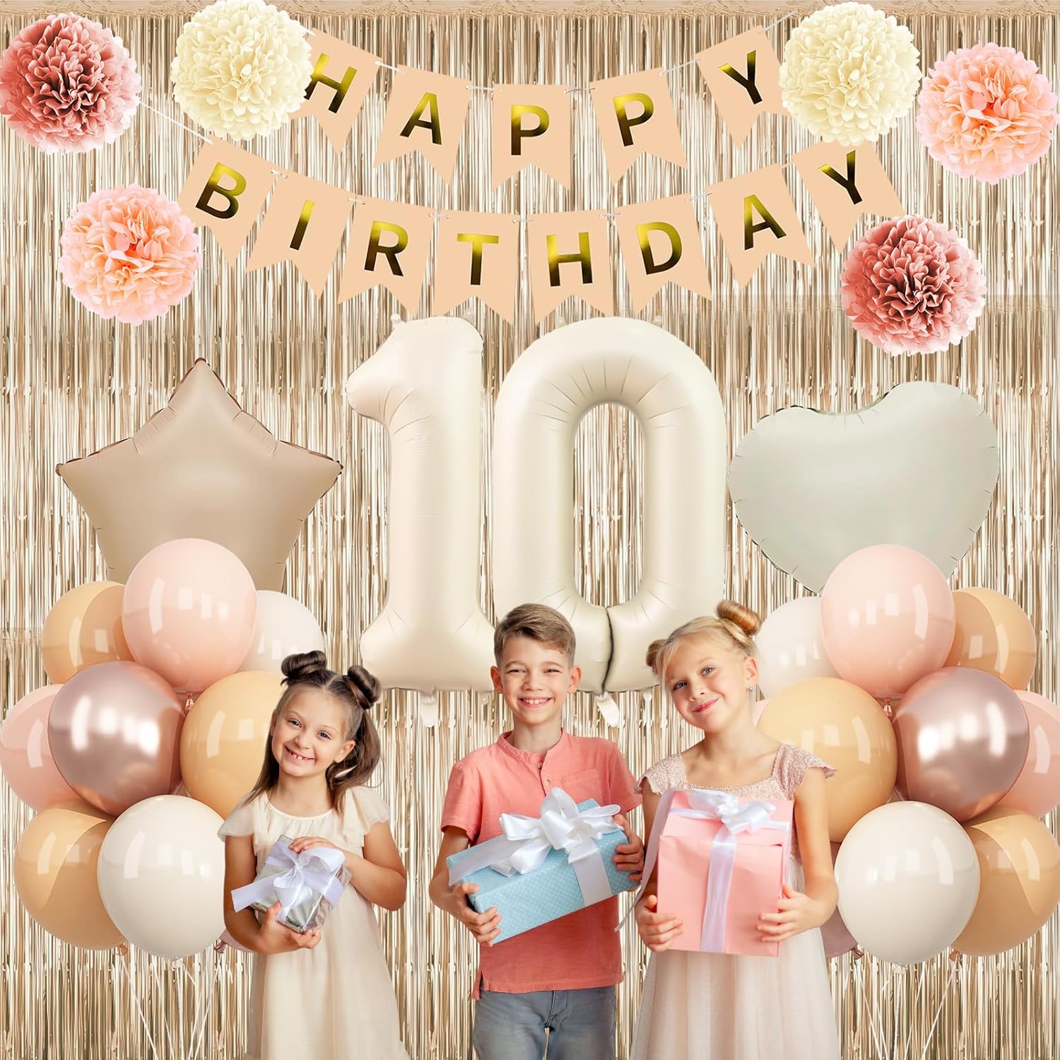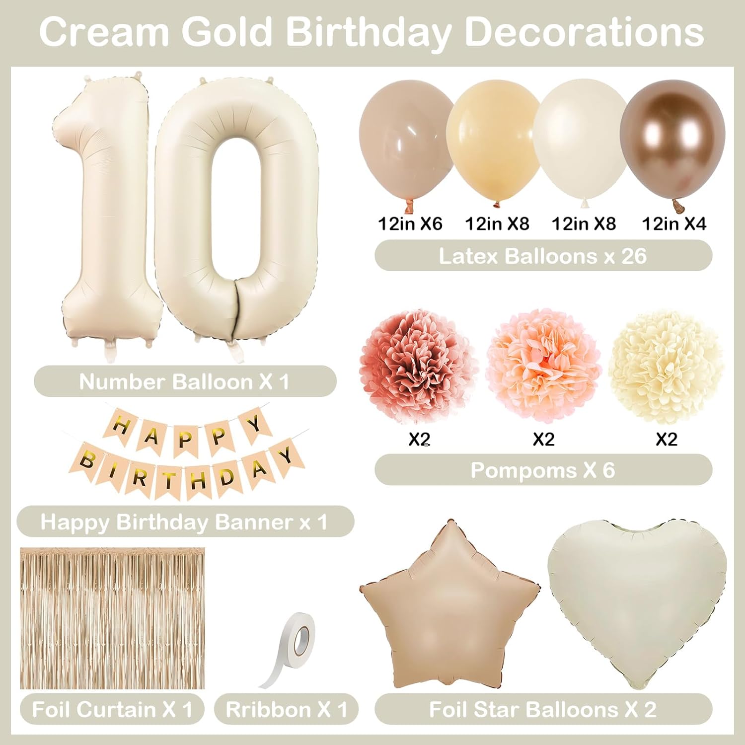 • PACKAGE INCLUDES: 1pc beige 10 number balloon, 1pc happy birthday banner, 2pcs dusty pink paper pom poms, 2pcs blush paper pom poms, 2pcs nude paper pom poms, 1pc champagne gold fringe curtain, 1pc caramel star foil balloons, 1pc cream heart foil balloons, 8pcs nude balloons, 6pcs blush balloons, 8pcs beige balloons, 4pcs champagne gold balloons, 1pc ribbon