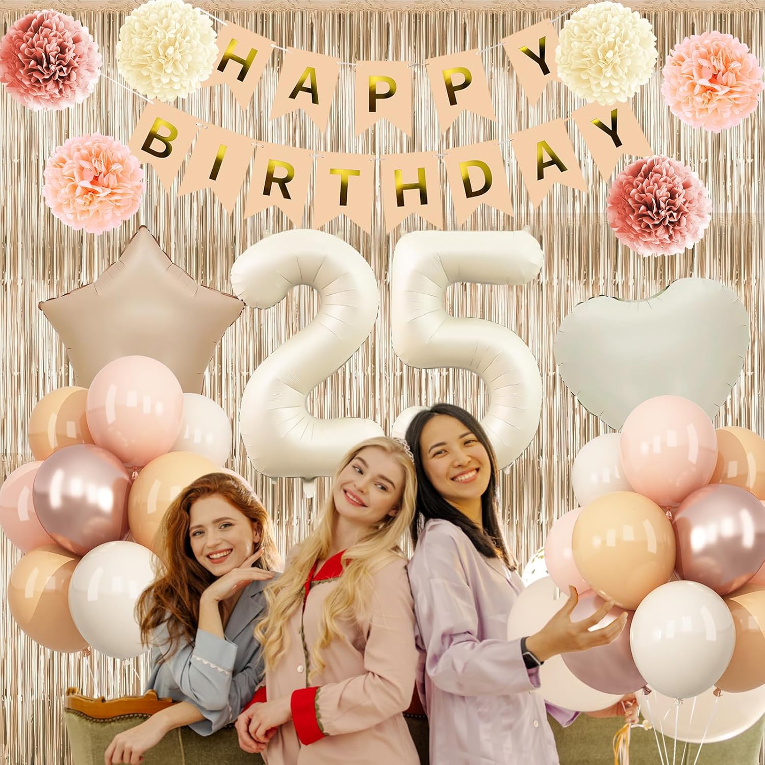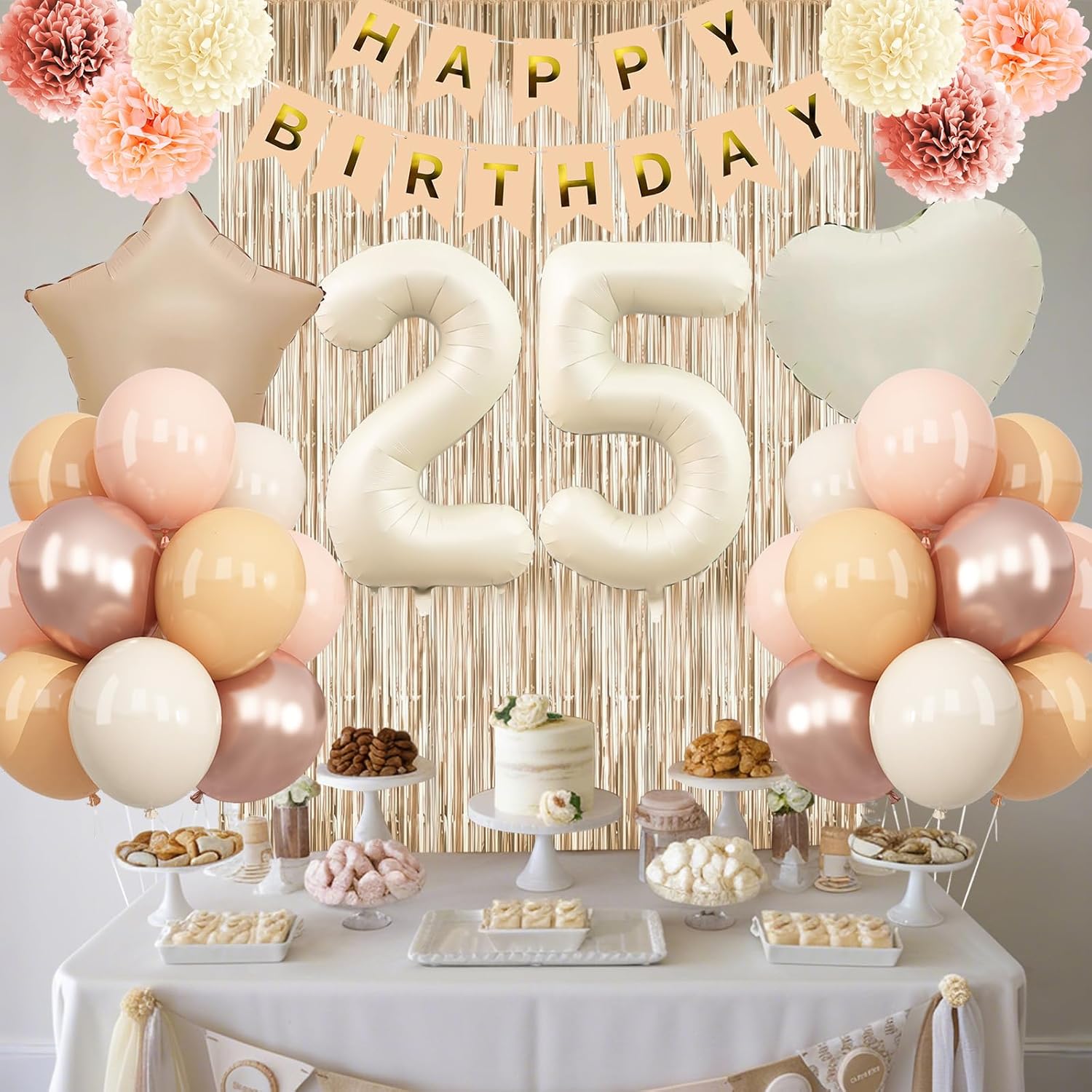• PACKAGE INCLUDES: 1pc beige 25 number balloon, 1pc happy birthday banner, 2pcs dusty pink paper pom poms, 2pcs blush paper pom poms, 2pcs nude paper pom poms, 1pc champagne gold fringe curtain, 1pc caramel star foil balloons, 1pc cream heart foil balloons, 8pcs nude balloons, 6pcs blush balloons, 8pcs beige balloons, 4pcs champagne gold balloons, 1pc ribbon