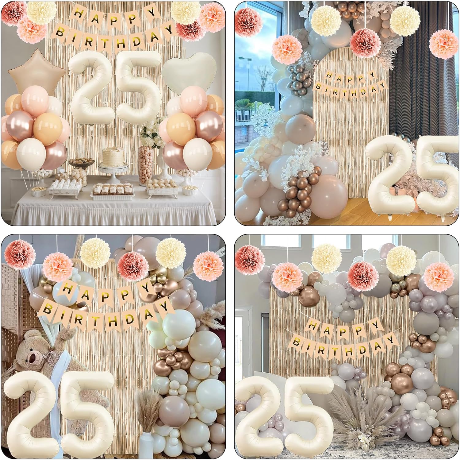 • ALL-IN-ONE DECORATION: Comes with a “25” foil number balloon, includes everything you need: birthday banner, fringe curtain, blush cream gold balloons, star foil balloons, paper pom poms, and ribbon, ideal for 25 year old birthdays for her, 25th birthday party, photo shoots, and family gatherings, suits both indoor and outdoor setups