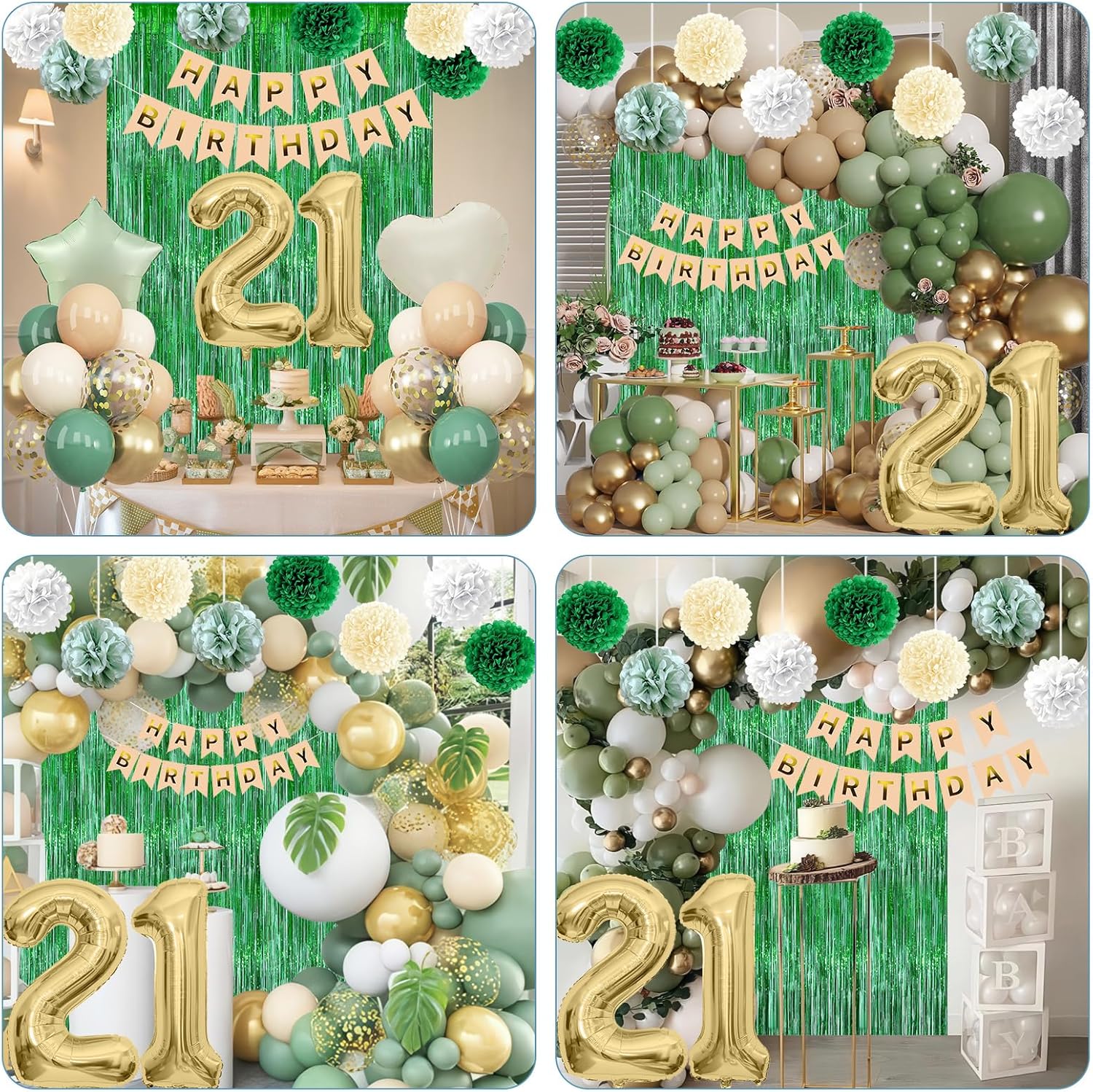 • PACKAGE INCLUDES: 1pc gold 21 number balloon, 1pc happy birthday banner, 2pcs deep green paper pom poms, 2pcs sage green paper pom poms, 2pcs nude paper pom poms, 2pcs white paper pom poms, 1pc green fringe curtain, 1pc olive green star foil balloons, 1pc cream heart foil balloons, 6pcs nude balloons, 6pcs sage green balloons, 6pcs beige balloons, 4pcs metallic gold balloons, 4pcs gold confetti balloons, 1pc ribbon