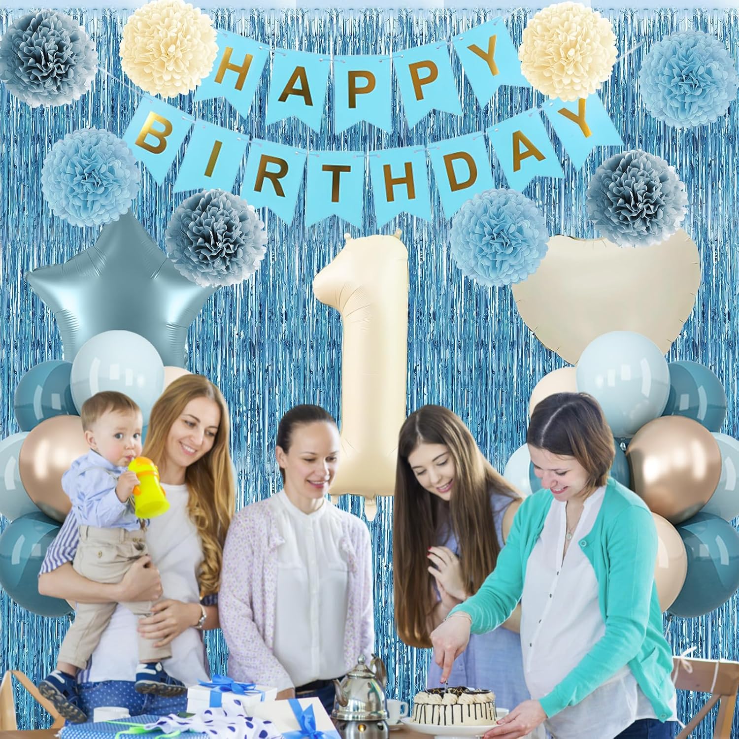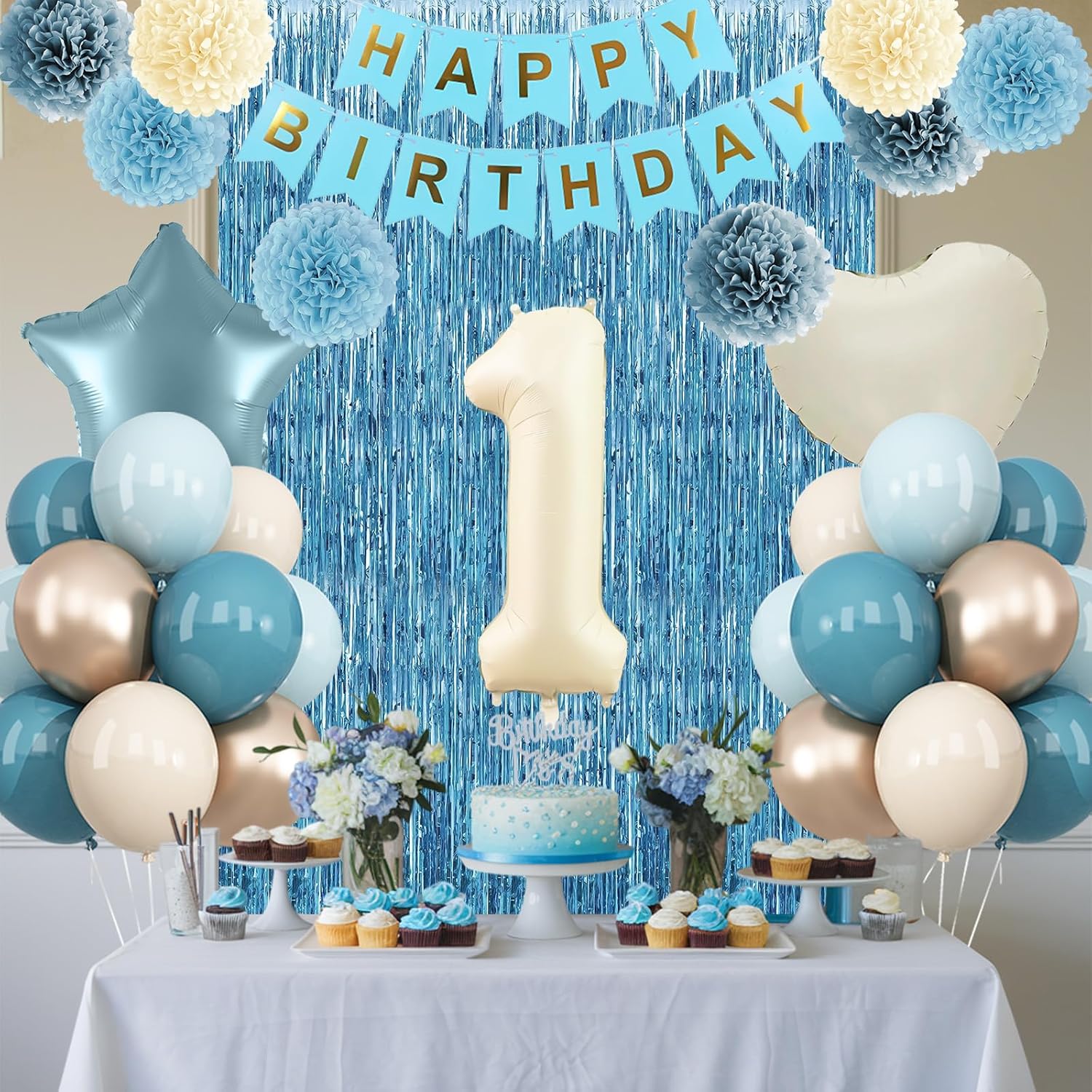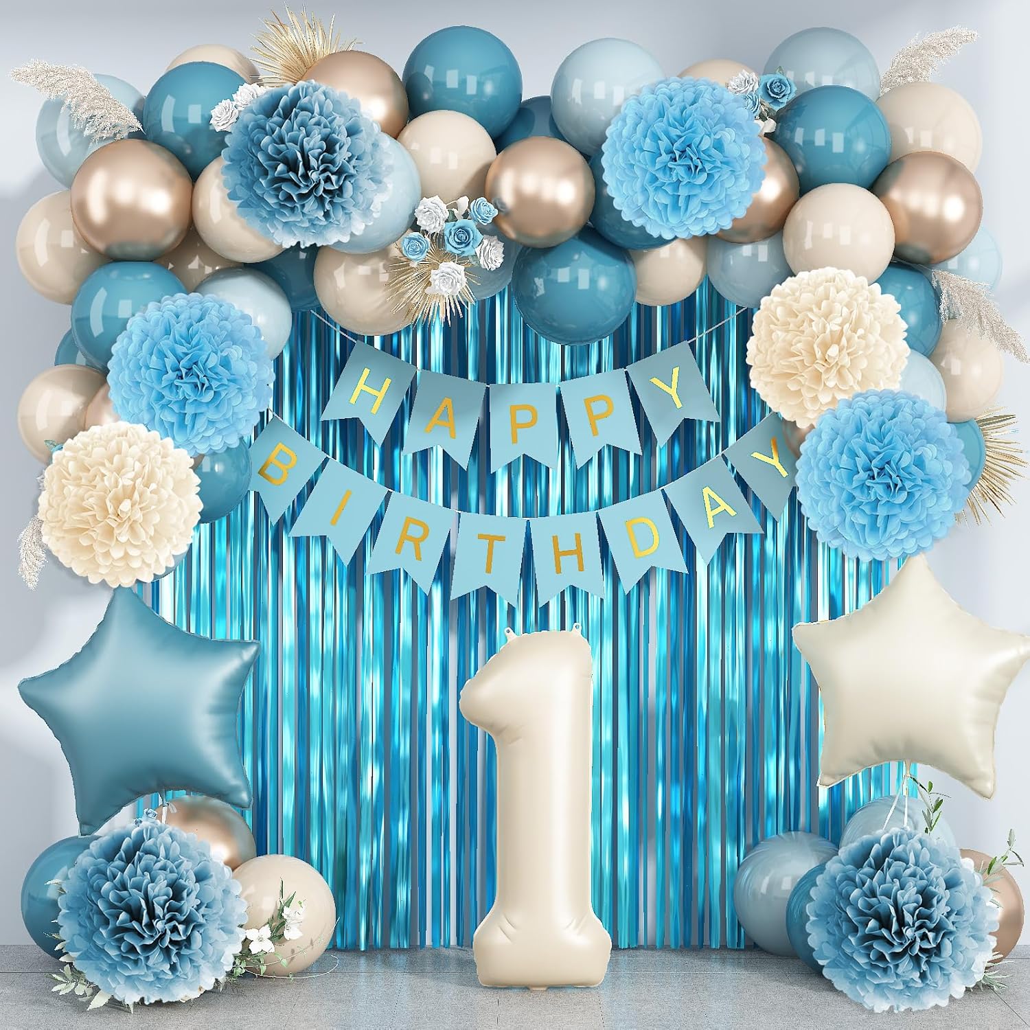 • ALL-IN-ONE DECORATION: Comes with a “1” foil number balloon, includes everything you need: birthday banner, fringe curtain, blue beige gold balloons, star foil balloons, paper pom poms, and ribbon, ideal for first birthdays, baby showers, milestone moments, photo shoots, and family gatherings, suits both indoor and outdoor setups