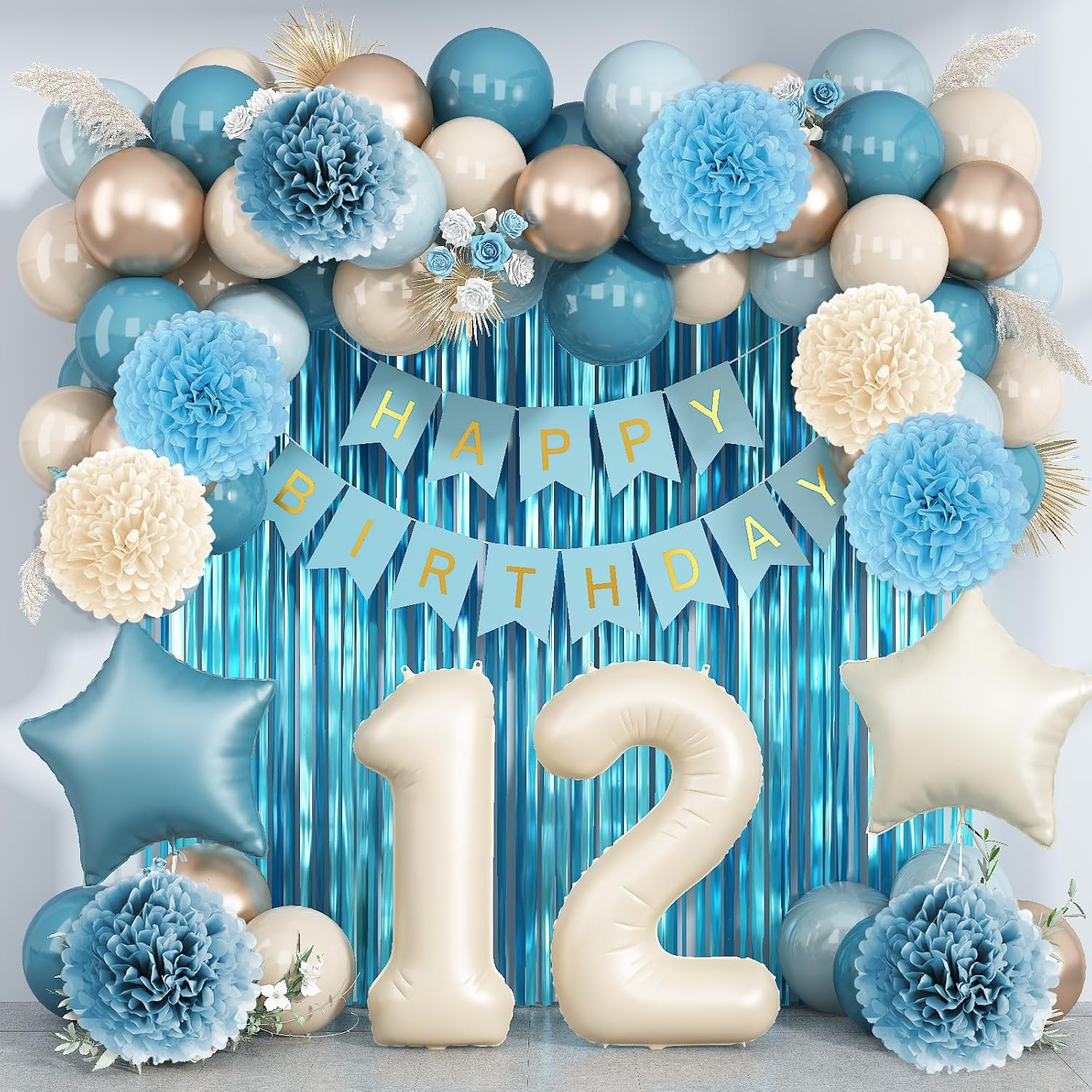 • ALL-IN-ONE DECORATION: Comes with a “12” foil number balloon, includes everything you need: birthday banner, fringe curtain, blue beige gold balloons, star foil balloons, paper pom poms, and ribbon, ideal for 12 year old birthdays, 12th birthday party, photo shoots, and family gatherings, suits both indoor and outdoor setups
