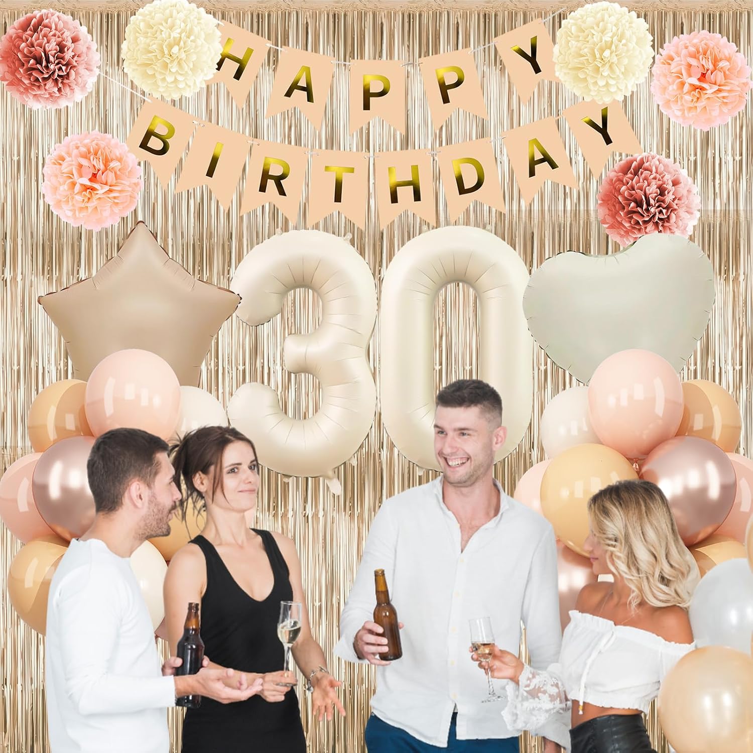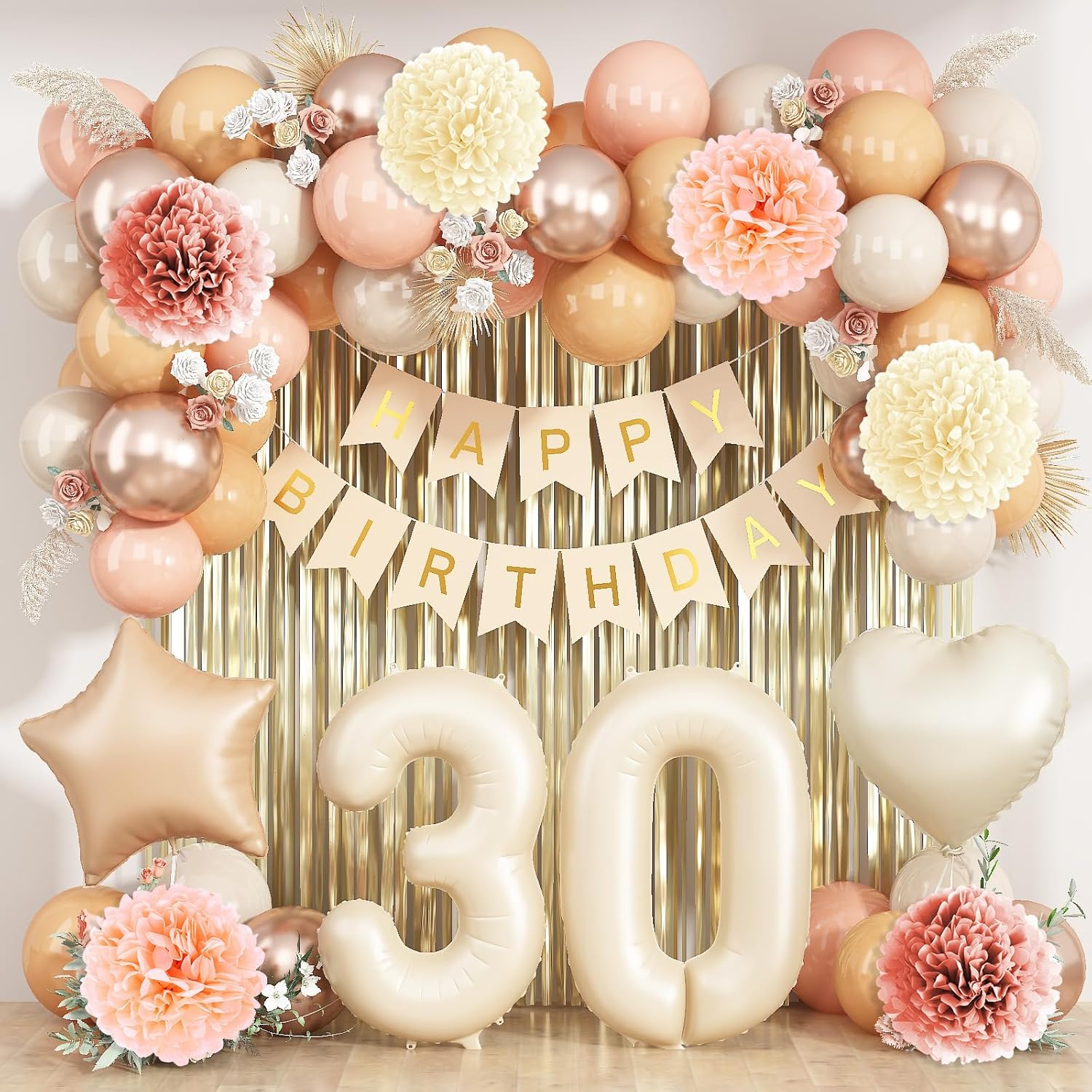 • PACKAGE INCLUDES: 1pc beige 30 number balloon, 1pc happy birthday banner, 2pcs dusty pink paper pom poms, 2pcs blush paper pom poms, 2pcs nude paper pom poms, 1pc champagne gold fringe curtain, 1pc caramel star foil balloons, 1pc cream heart foil balloons, 8pcs nude balloons, 6pcs blush balloons, 8pcs beige balloons, 4pcs champagne gold balloons, 1pc ribbon