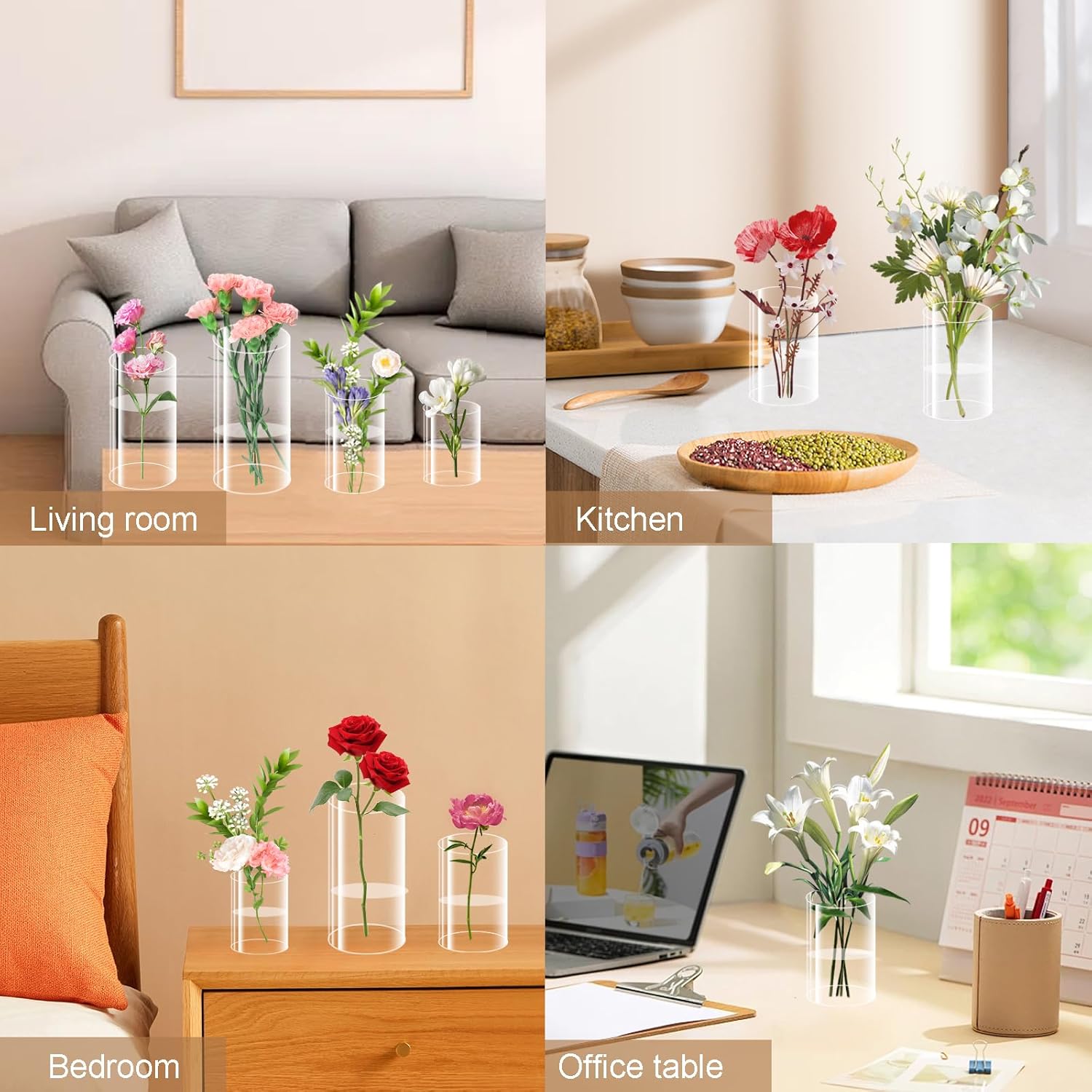 • Wide Application: Our clear acrylic vases are suitable as storage containers for decorating flowers, green plants, succulents, and candlesticks. Placed on tables, kitchens, or dining tables, acrylic vases add a relaxed atmosphere and can bring visual pleasure to people.