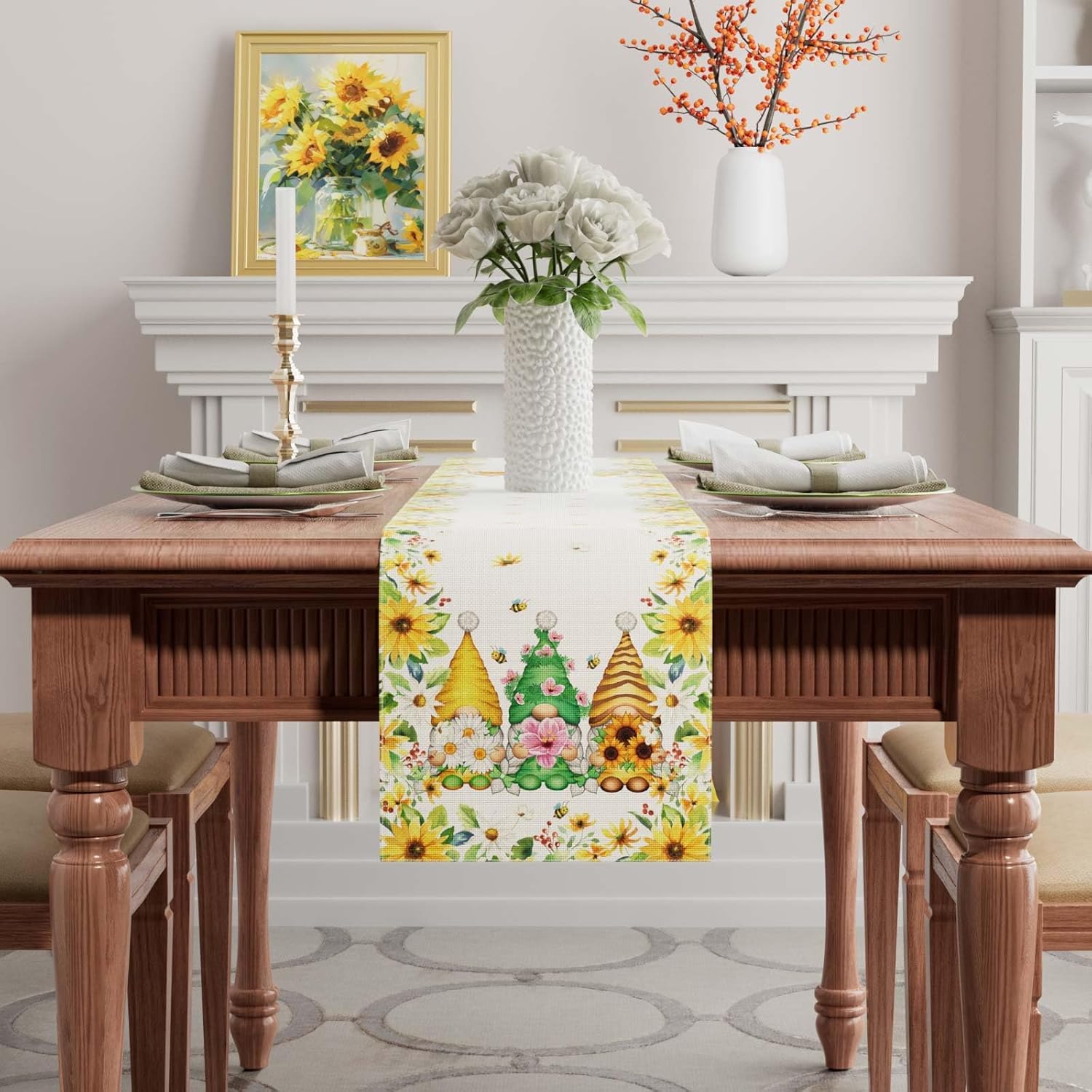 XCHI Yellow White Daisies Flowers Gnomes Spring Table Runner Burlap Table Decoration for Summer Seasonal Home Kitchen Dining Dinner Indoor Holiday Farmhouse Decor 13x60 Inch
