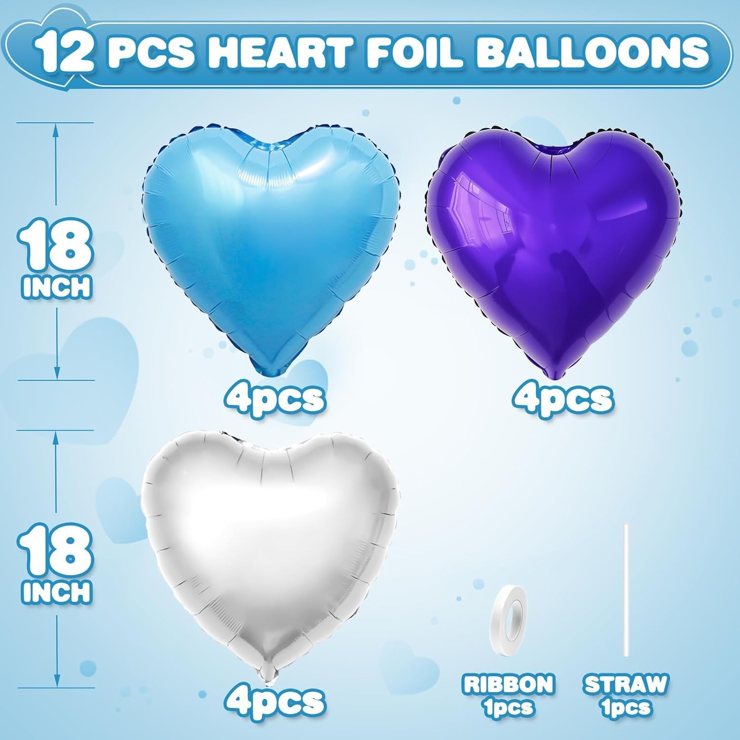 • 12PCS HEART BALLOONS:Package include 4pcs blue heart foil balloons,4pcs purple foil balloons,4pcs silver heart foil balloons,1pc straw.Large enough to help you better decorate your party.