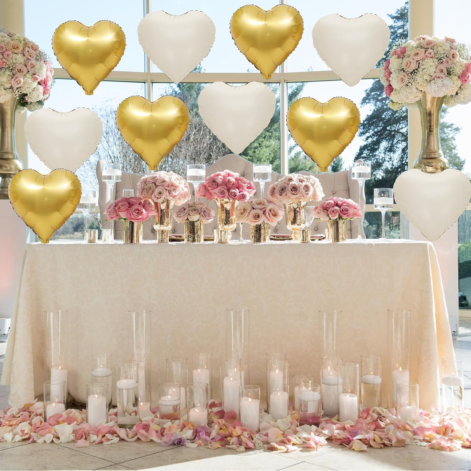 • 12PCS HEART BALLOONS:Package include 6pcs cream white heart foil balloons,6pcs metallic gold heart foil balloons,1pc straw.Large enough to help you better decorate your party.