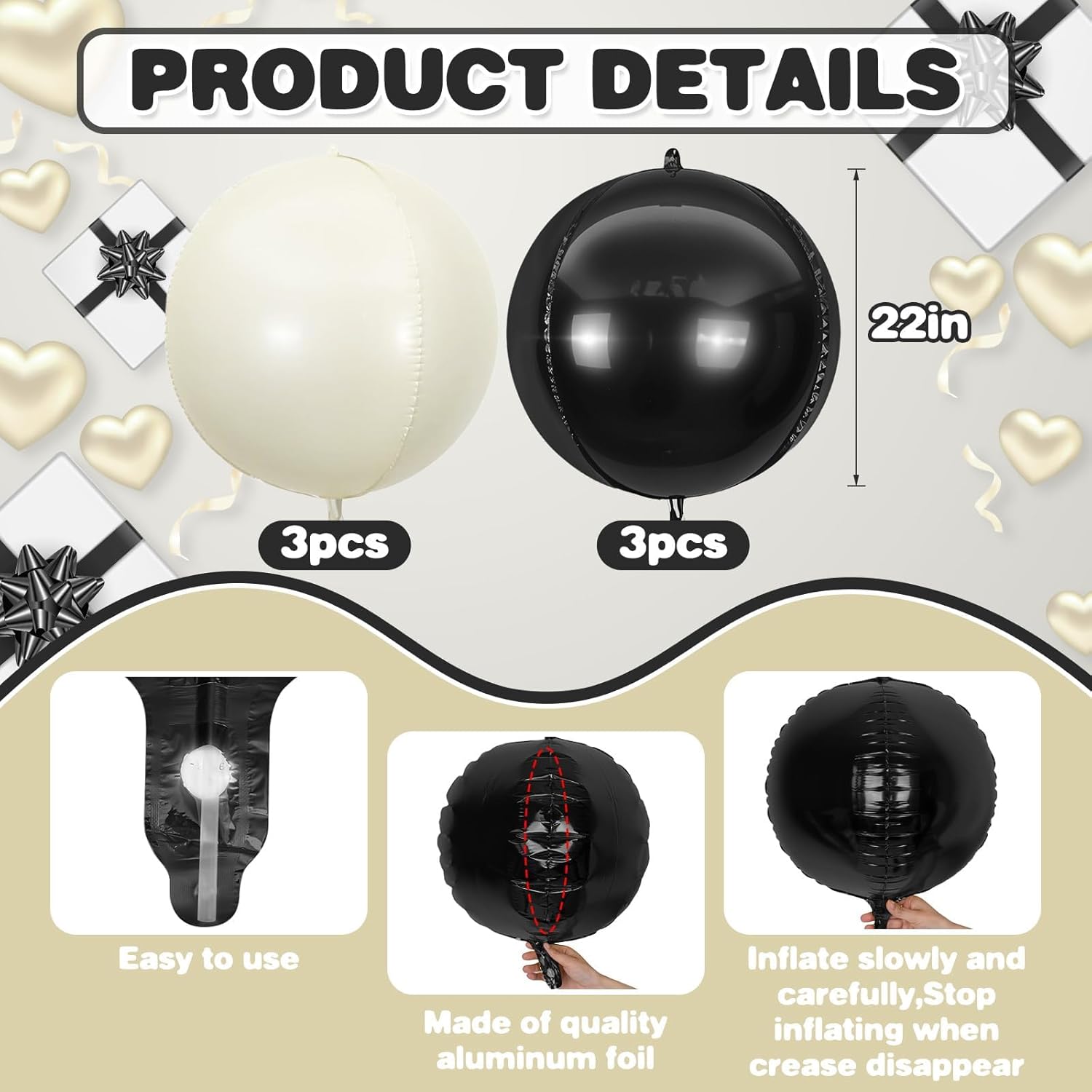 • 【6PCS ROUND BALLOONS】package include 6pcs 22inch Black White round giant 4D foil balloons. The Black White round balloons are large enough to help you better decorate your party.