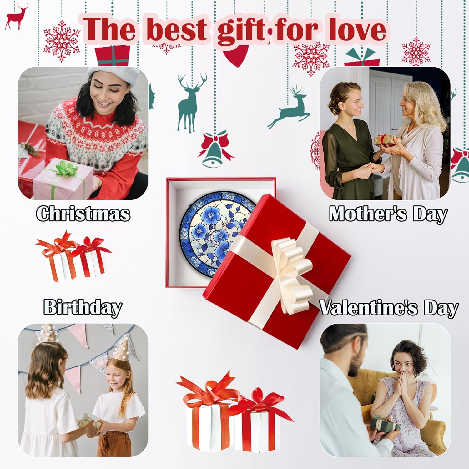 Stained Glass Window Hanging, Blue and White Plum Blossom Sun Catcher for Door Home Decor Flowers Suncatcher Christmas Mother's Day Birthday Gifts for Women Men Mom and Nana 15 in
