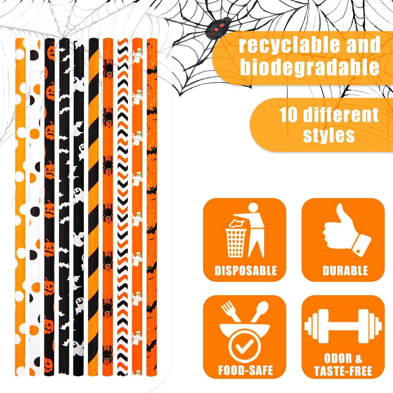• HALLOWEEN THEME STRAWS - Our paper straws are printed in Halloween theme patterns, such as Jack-o-Lantern, bats, spiders, skeletons, ghosts, etc., and come in Halloween themed colors in orange, black and white, which can add the Halloween party atmosphere more intense.