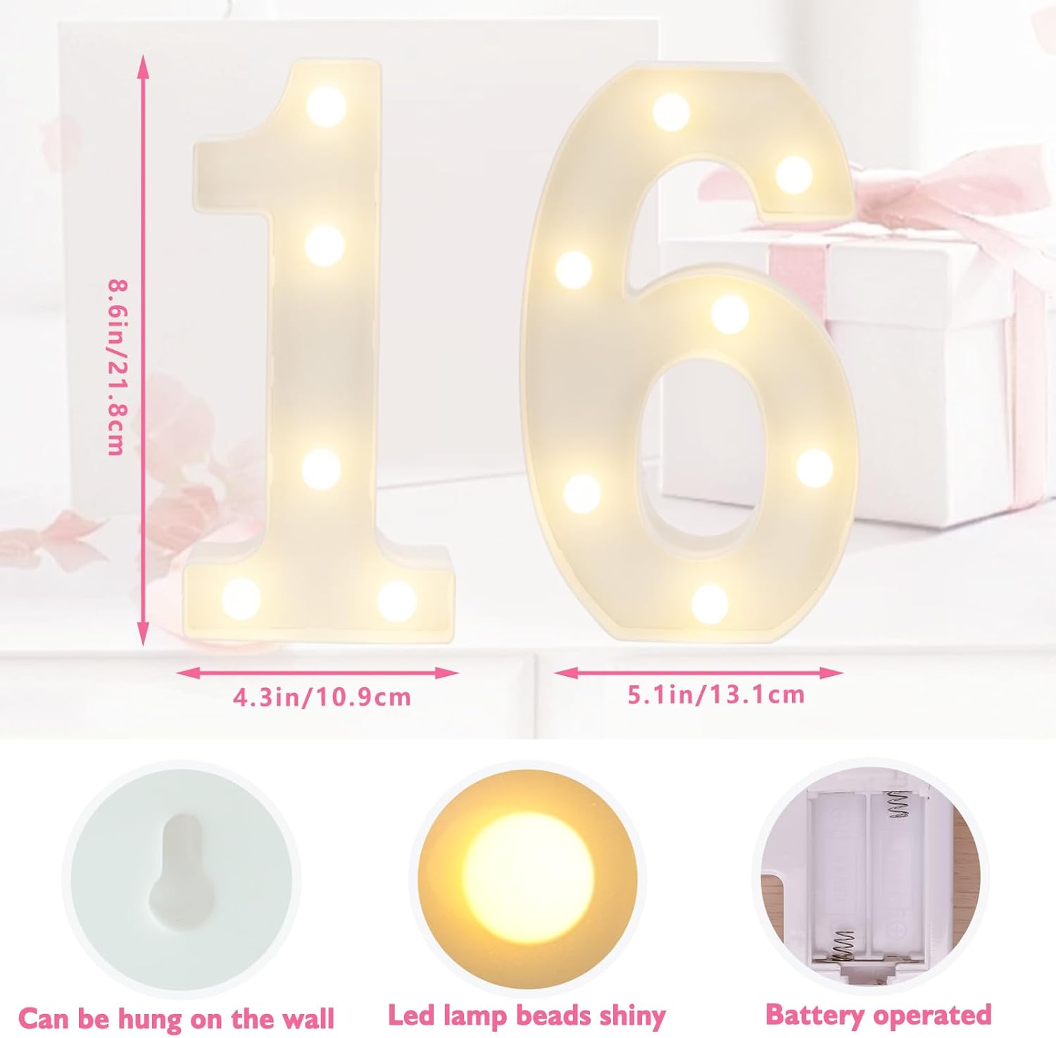 • 【Light Up Your Birthday】 Light up number lights are great birthday party supplies and decorations, perfect for all kinds of scenes and memorable moments. Light up your birthday party by spelling out “16” with our number lights, light up the wonderful moments, warm white lights create a cozy atmosphere, make your 16th birthday party more memorable and sparkling!