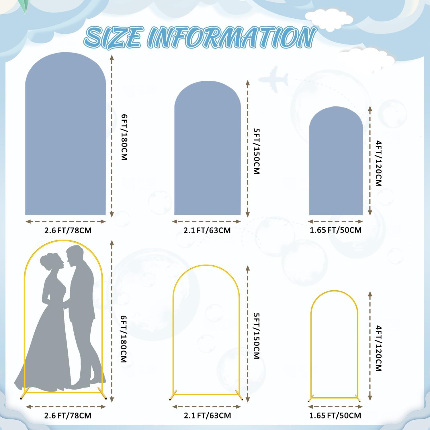 • 🧸【Size Information- Arch Backdrop Stand and Cover Set】Arch stand and cover set includes 3 gold metal arch backdrop stands and 3 dusty blue arch cover in sizes 6FT x 2.6FT(H x W), 5FT x 2.1FT(H x W) and 4FT x 1.65FT(H x W). The backdrop arch stand with cover is certain to meet your decoration needs and add a charming look to your celebrations.