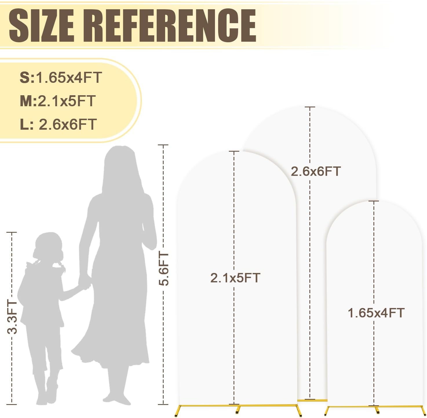 • ⭐Size Guide - Arch Backdrop Stand and Cover Set: The size of arch backdrop stand set about are 1.25FTx4FT(W x H), 2.1FTx5FT(W x H), 2.6FTx6FT(W x H) with white arch cover set. Metal arch backdrop stand set add a graceful and striking look for your party or event.