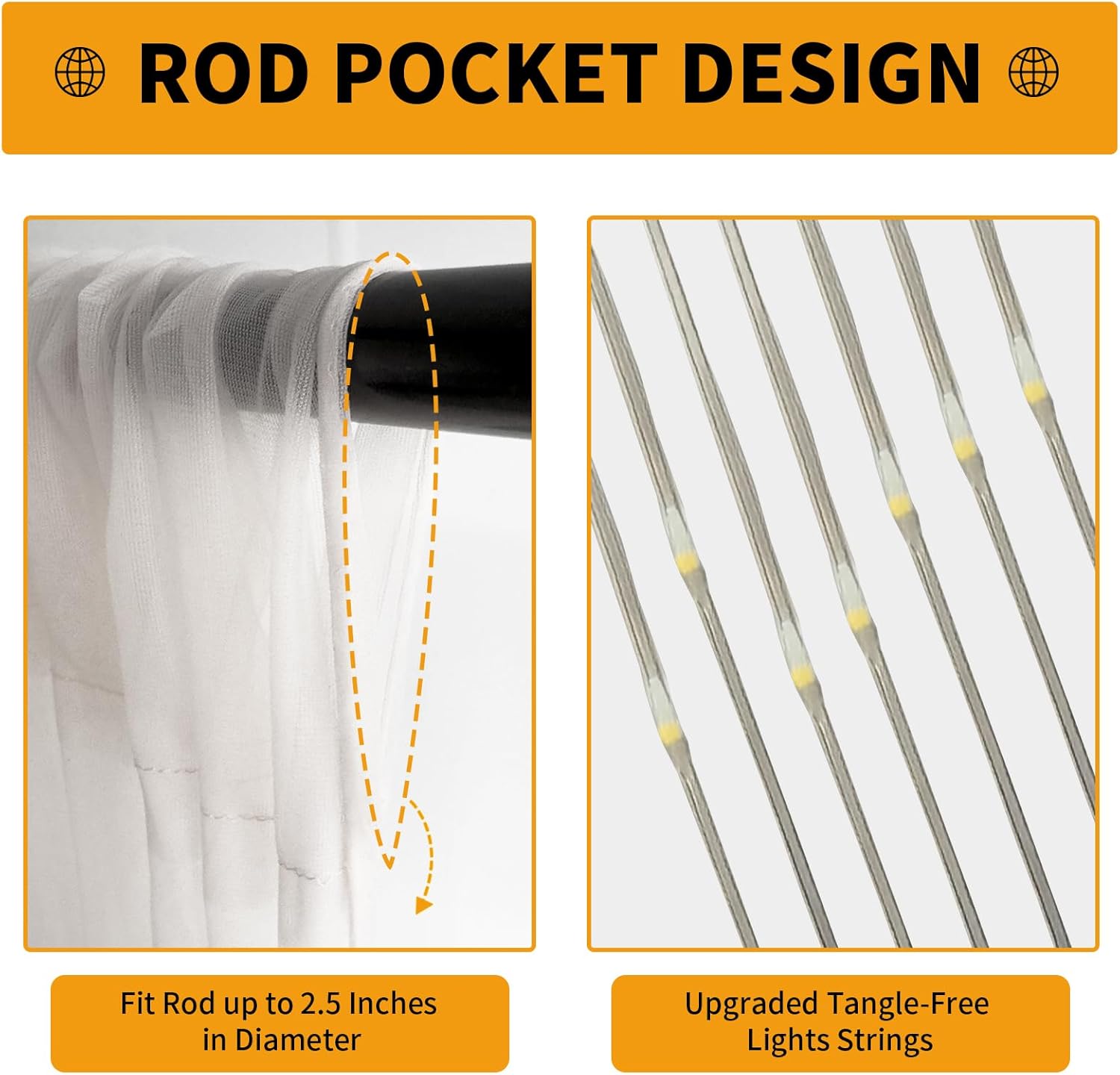 • Elegant Combination of Tulle Backdrop Curtains and Lights - Package Includes: 2 panels white sheer tulle backdrop curtains (5ft x10ft each, total 10x10ft).1 set of a 10x10ft warm white USB-powered tangle-free string lights (10 strands with 300 LEDs). 12 Transparent clips for hassle-free Installation. (Pro Tip: Buy multiple sets for fuller coverage and reduced sheerness!)