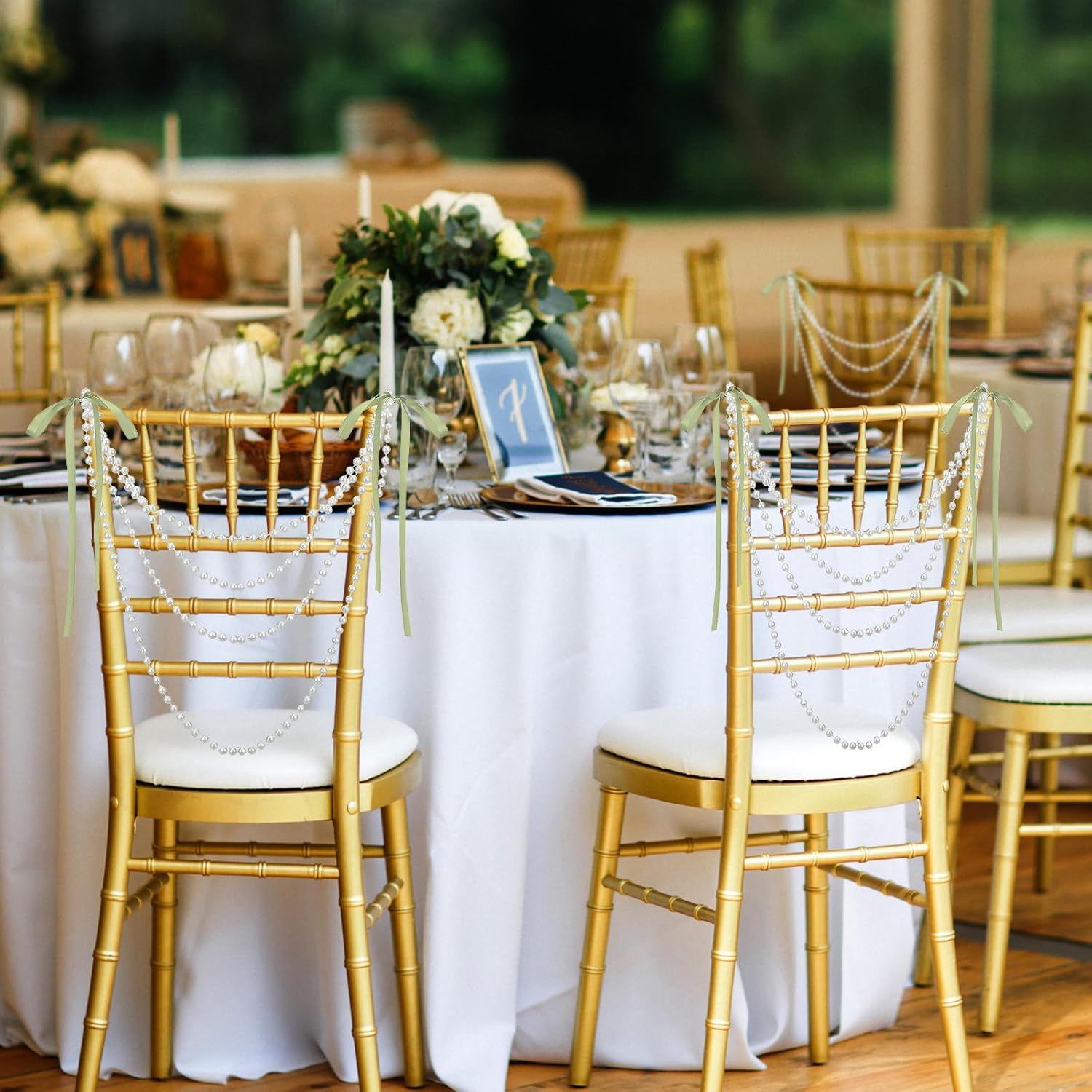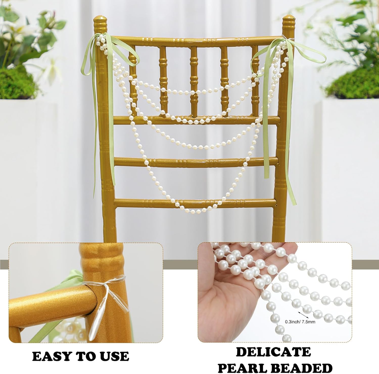 • Ideal Sized for Easy Application: the pre tied bows pearl string chair, measuring about 0.3 inch/ 7.5 mm in pearl's diameter and featuring about a width of 16 inches/ 40 cm and height of 12 inches/ 30.5 cm, is pre tied bows pearl string chair decorated for practicality; The gray green bows have an adjustable 43 inches/ 110 cm long ribbon, making them suitable for both indoor and outdoor settings without the worry of deformation or breakage