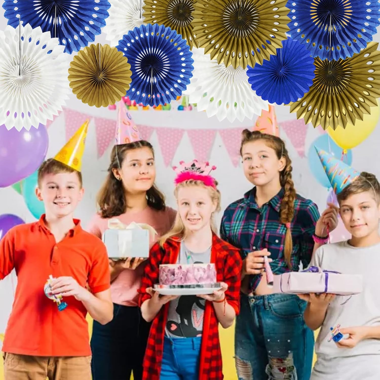 • Hanging decoration kit】 honeycomb paper fan set includes 11 paper fans of different sizes, among which the paper flower fan size is 16 inches * 3, 12 inches * 3, 8 inches * 3, 6 inches*2,color include blue,gold,white.