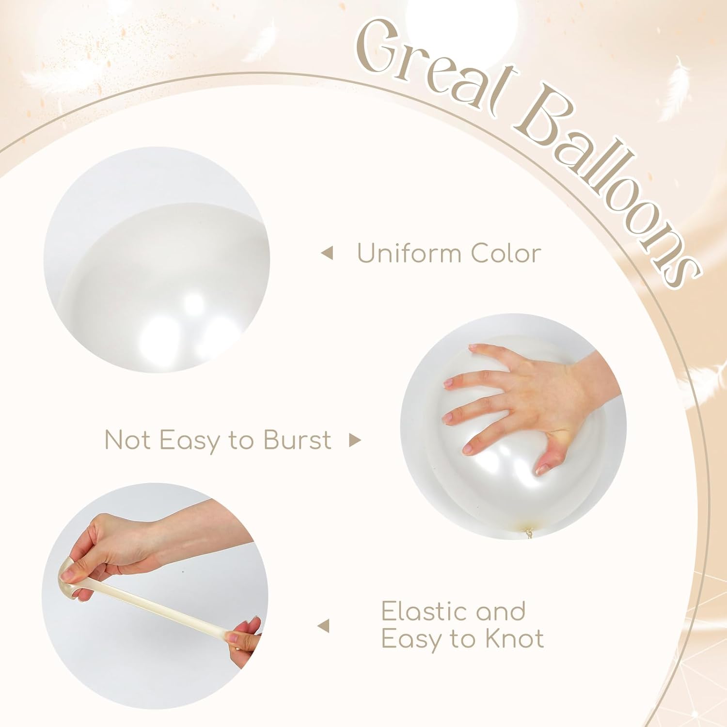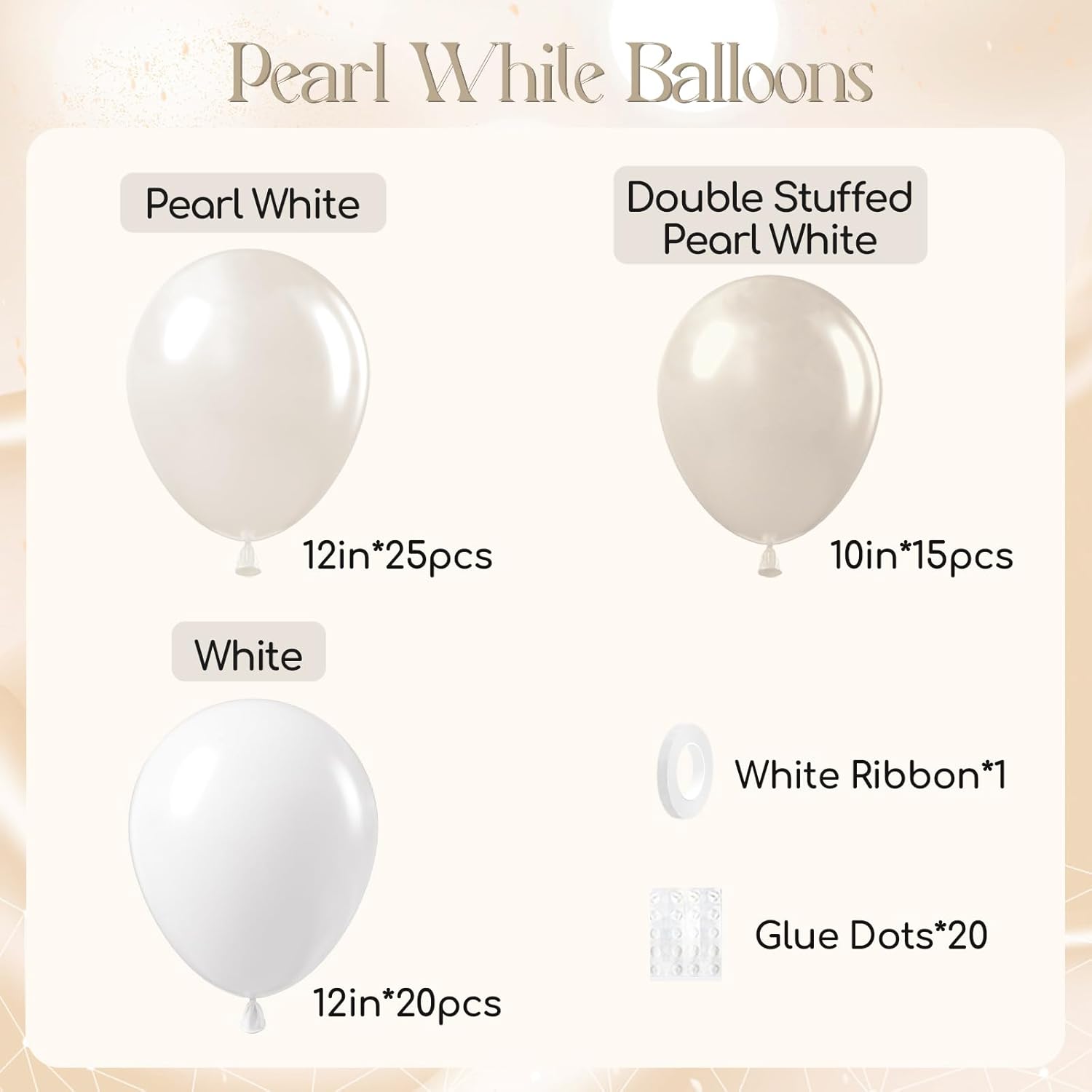 • What You Will Get: The package includes pearl white balloons include 12inch white balloonsx20, 12inch pearl white balloonsx25, 10inch pearl white double stuffed balloonsx15, white ribbonx1, glue dotsx20