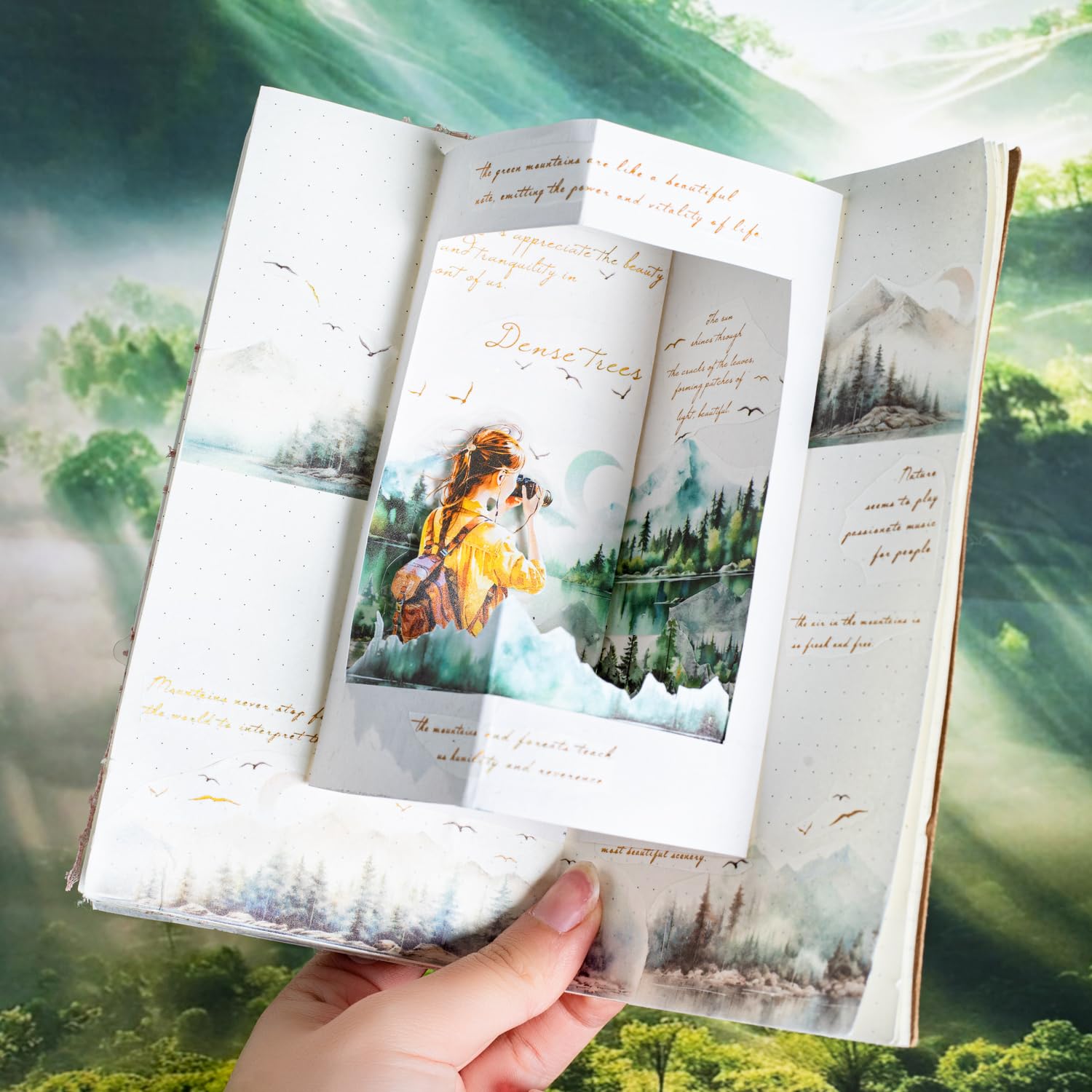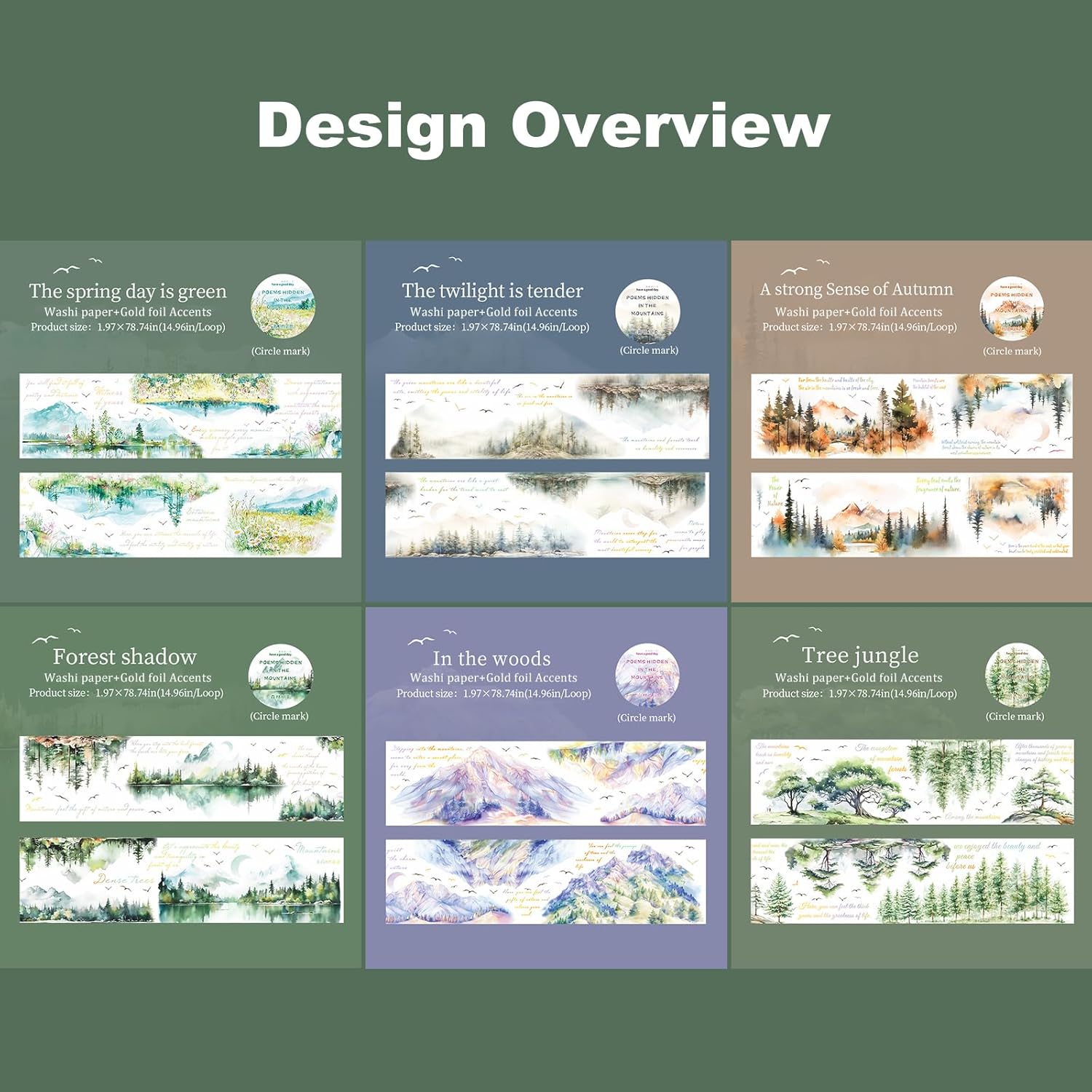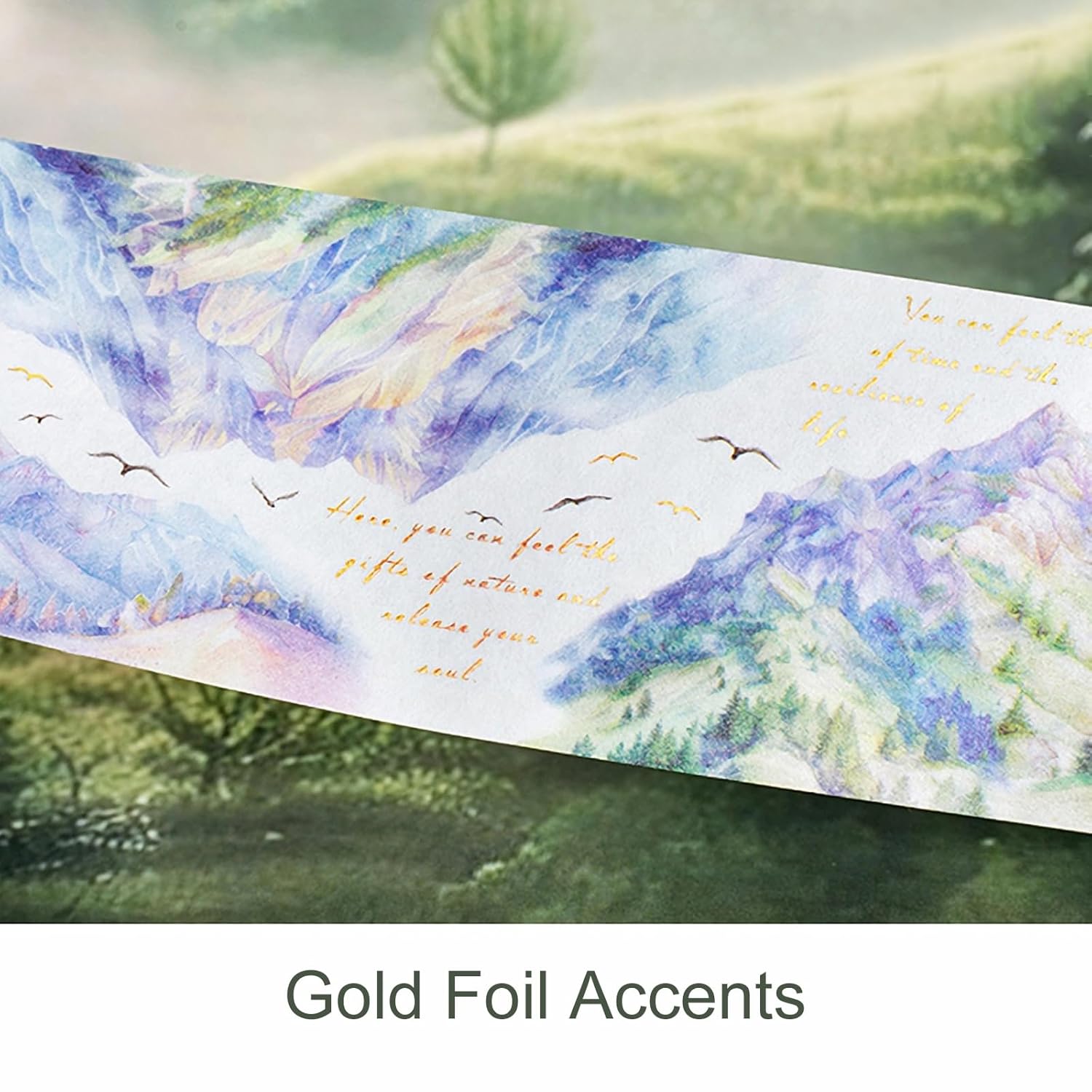 • Scenic Nature Designs: Features 6 washi rolls with poetic forest, mountain, and seasonal themes, enhanced by delicate text. Brings immersive calm and visual poetry to journals and scrapbooks