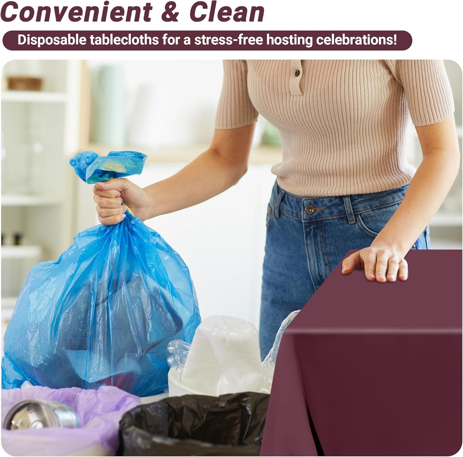 • Multi-Purpose Use: Transform every occasion with our wine-red plastic table cover, crafted to effortlessly transition from rustic BBQ party decorations to elegant anniversary table setups. This square tablecloth adapts to diverse needs—cover it over picnic tables for casual outdoor gatherings, proving one table cloth truly conquers all seasons and celebrations.