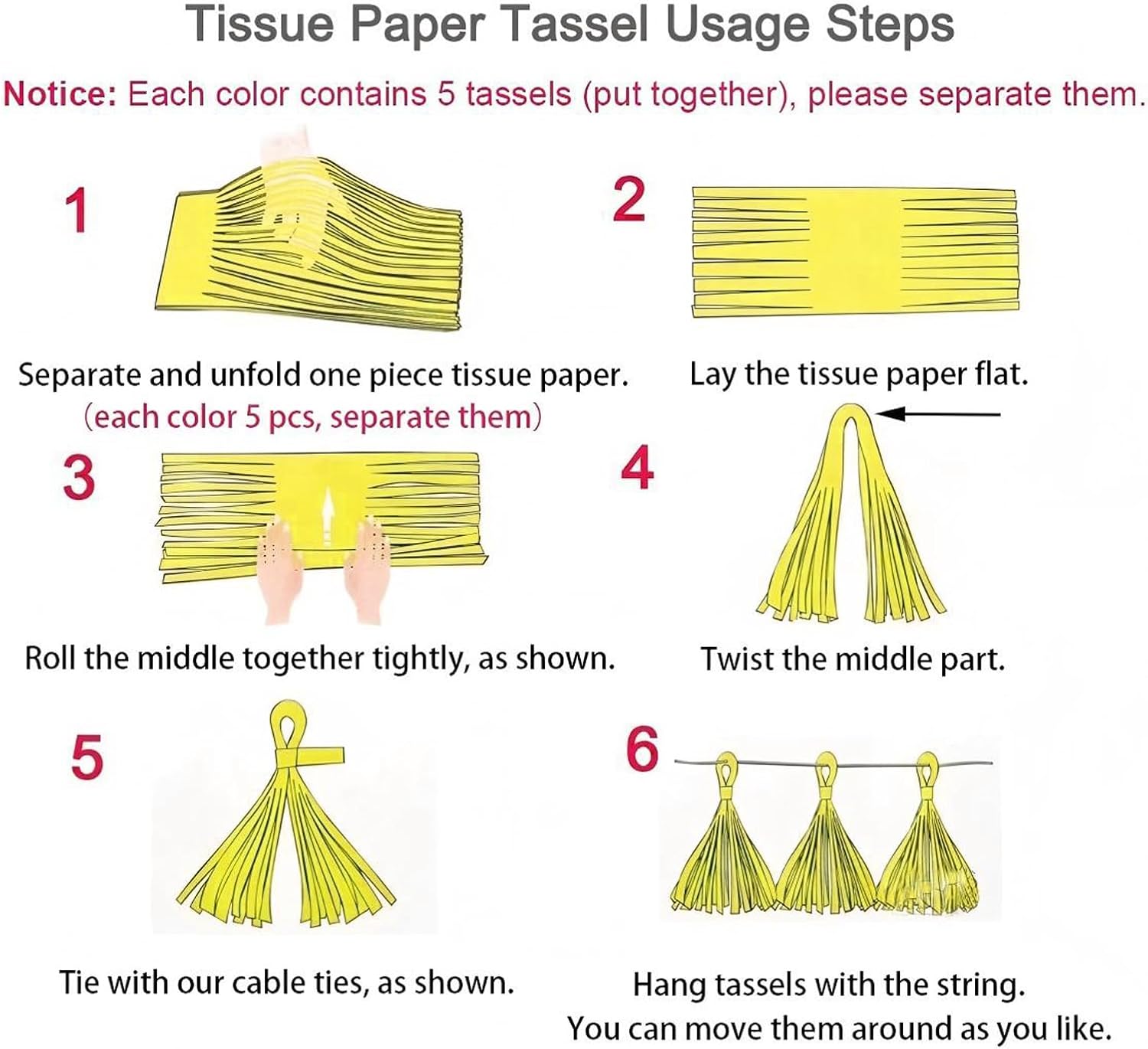 • Tissue Paper Tassels:This product can be used for Birthday, Baby Showers,Bridal shower,Weddding,Engagement,Anniversary,Graduation Celebrations,It's a nice choice and will add happy atmosphere to any event you may have.
