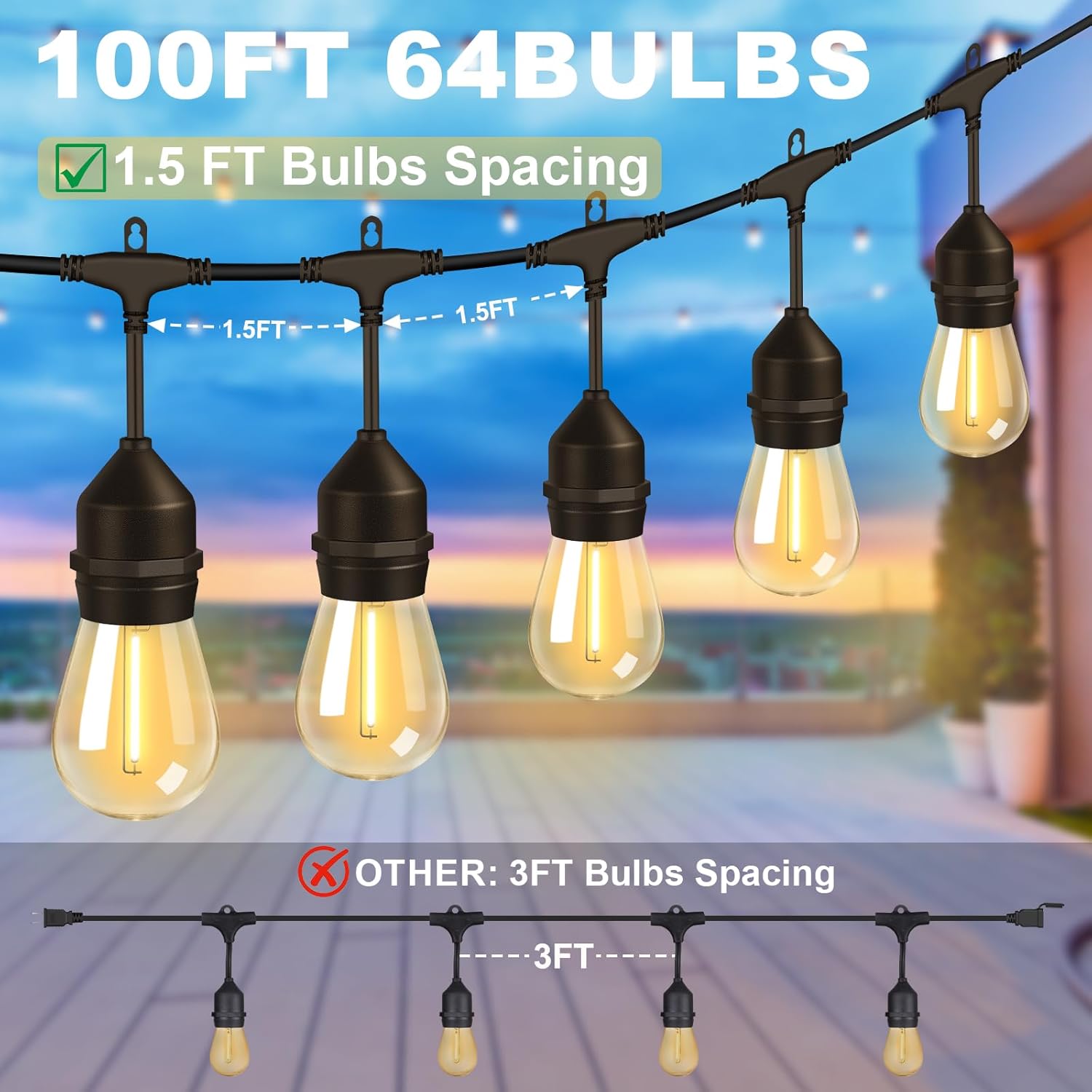 • ✅【𝟏.𝟓𝐅𝐓 𝐁𝐮𝐥𝐛𝐬 𝐒𝐩𝐚𝐜𝐢𝐧𝐠】Porbench made a new breakthrough that 100FT outdoor string lights waterproof contains 64+4 shatterproof bulbs, each spaced only 1.5FT spacing (others more than 3.8FT), make the light more concentrated. Up to 14 end-to-end groups can be connected to create the ultimate in ambience and stunning visual impact.