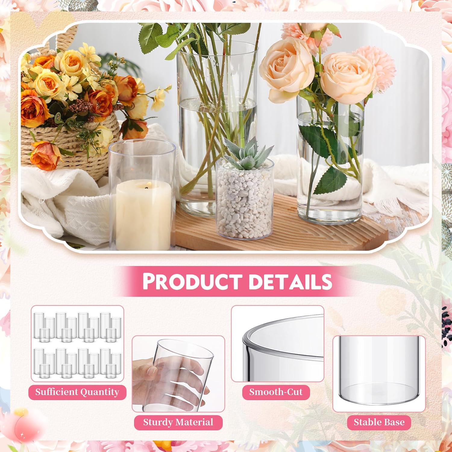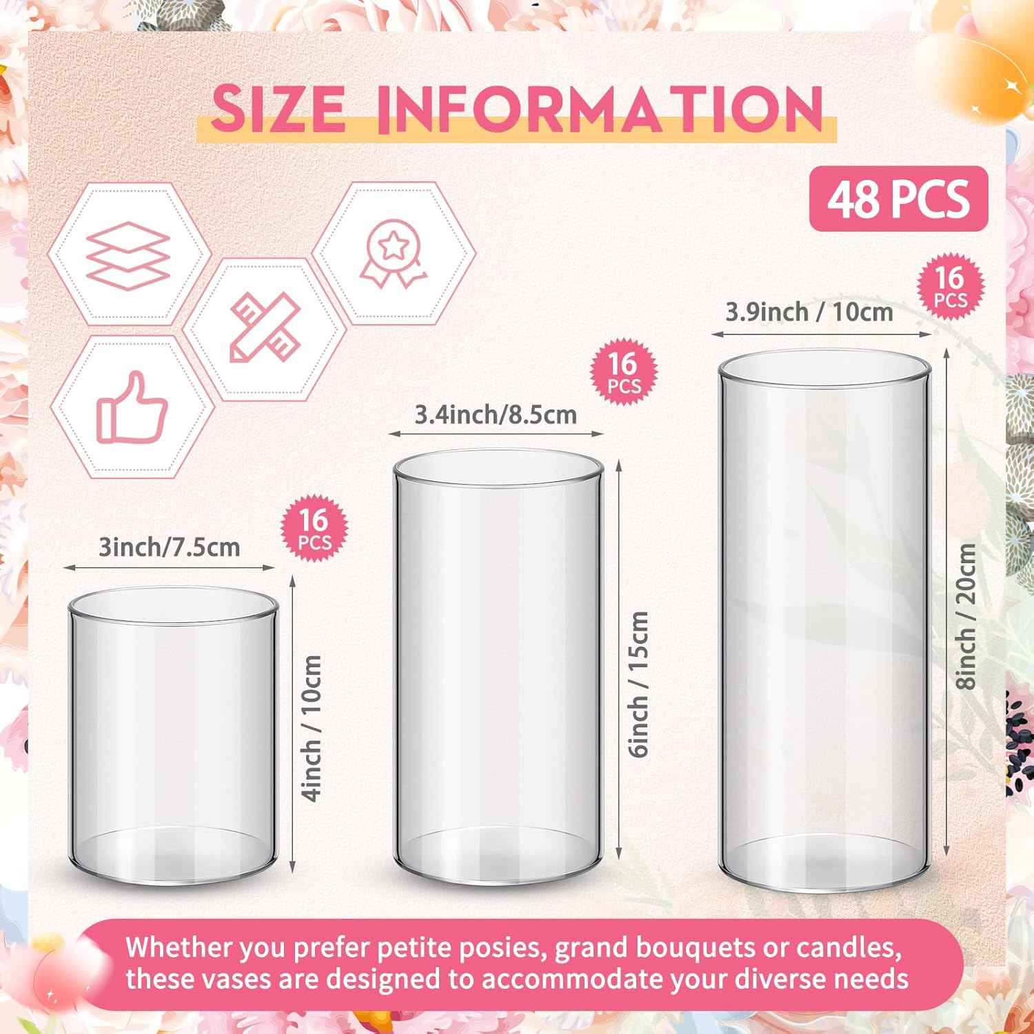 • Abundant Quantity: with 48 clear cylinder vases included in the package, you'll have an ample supply for your floral arrangements or decorative displays; Whether you're organizing a large event or simply enjoy regularly refreshing your room decor, this set provides the quantity you need to effortlessly adorn multiple spaces