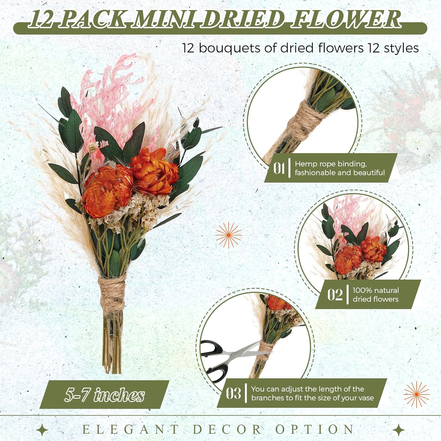 • Abundant and Versatile Collection: you will receive 12 dried bouquets which are beautiful and energetic in various colors and styles; This abundant quantity ensures that there are plenty for your daily use, replacements, and varied decorative applications; This collection suits different people's tastes, making your Bohemian wedding or home decoration project more lively and refreshing
