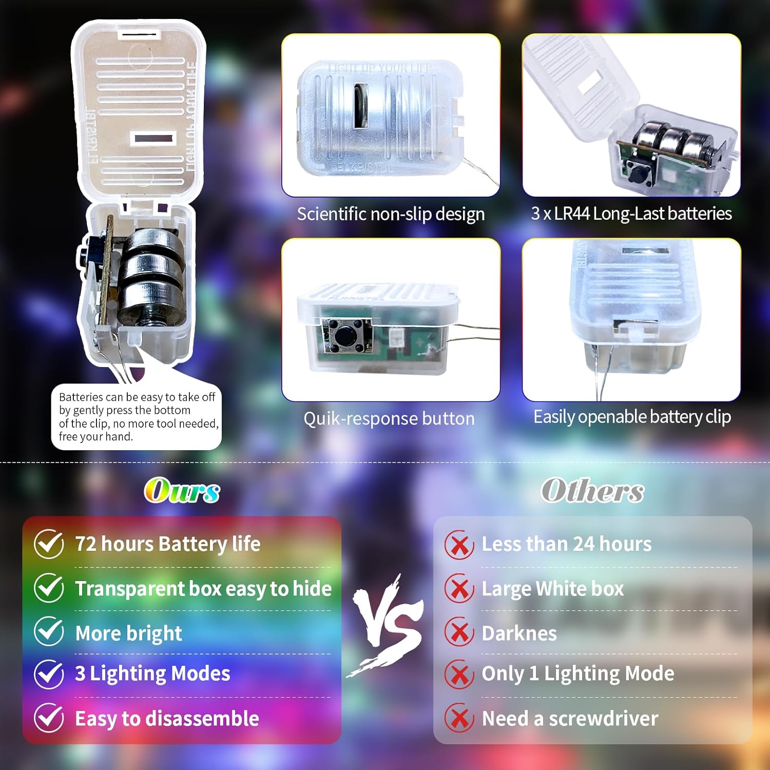 • PREMIUM QUALITY AND LONG LAST LIFE: 100 pack in a box, each twinkle lights made of high quality durable 7 feet long flexible silver wire, and 20 energy-efficient mini led fairy lights, 4 inch distance between each led moon lights. This fairy lights battery operated by 3 x LR44 batteries (included), which can provide 101 hours life. This Christmas lights is perfect for both everyday decorations as well as holiday decor (Batteries need to be replaced when the string get dims)