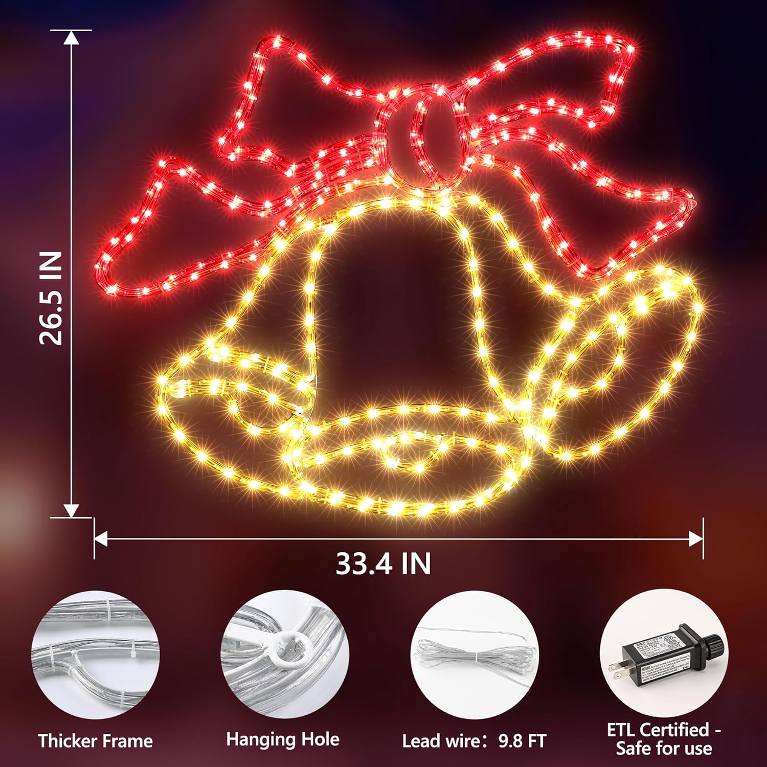 • Christmas Bells Lights: 9.85 FT Long lead wire. Just plug in OR unplug it for power on or off. 24V low volatge, safe for your family. Perfect for indoor and outdoor, easy to install, and look great! Brighten up any occasion widely including Christmas parties, weddings, thanksgiving days, gardens.