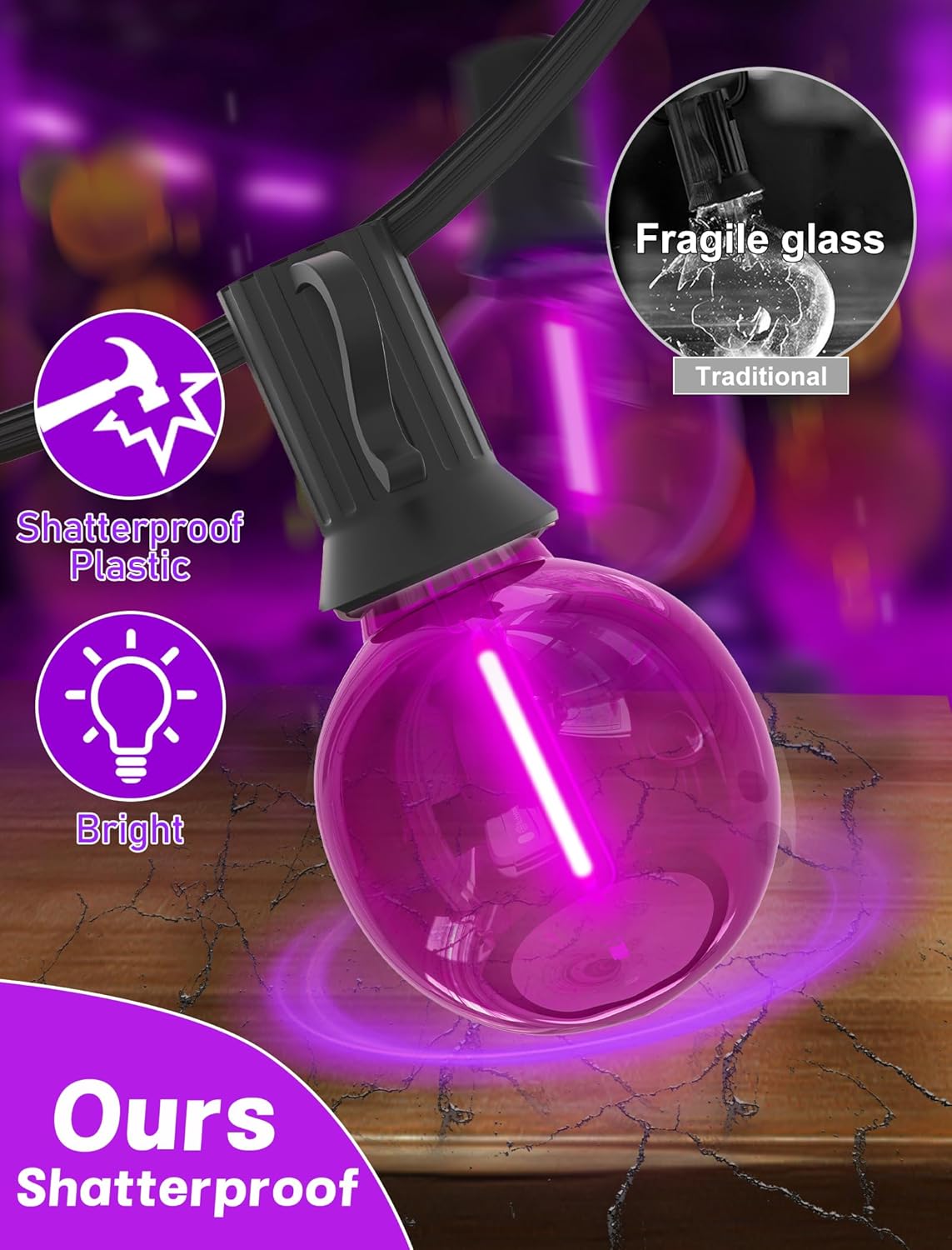 • Practical and easy to install: G40 purple string lights can be easily installed using cable ties or cup hooks, you can fix it or place it anywhere as needed. The safe and reliable orange led lights are equipped with an E12 socket base and a built-in spare fuse for easy replacement