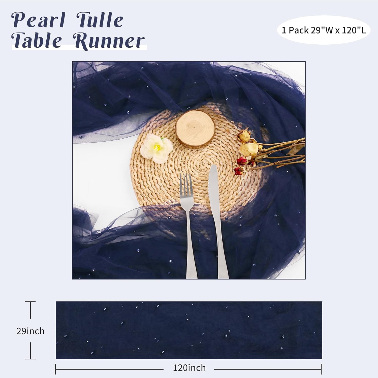 Pearl Table Runner 29 x 120 Inch Tulle Fabric Lace Table Runners Boho Rustic Tablecloth for Bridal Shower Birthday Party Wedding Arch Aisle Veil Dessert Table Decor(1 Pack, Navy Blue)