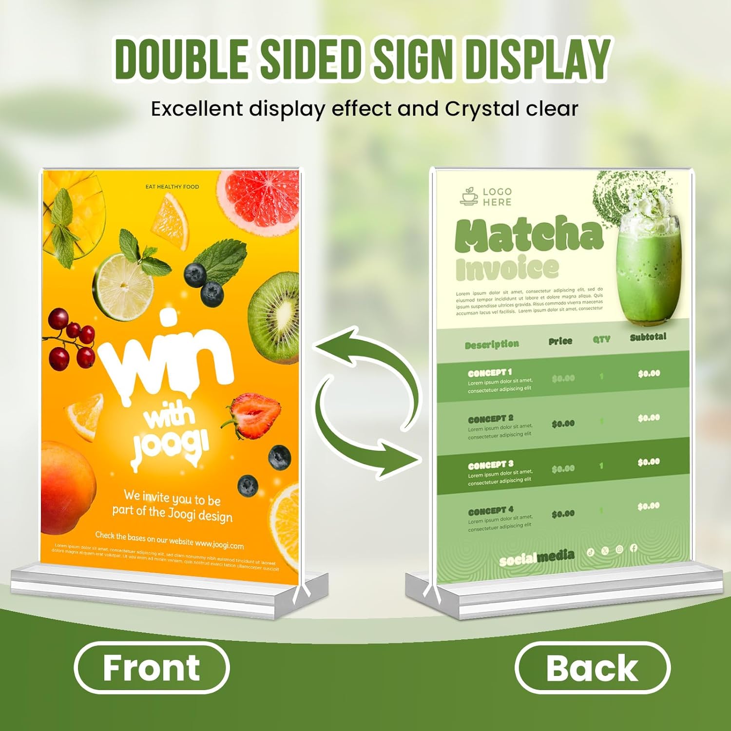 • 【Double Sided Sign Stand】This 25 Pack acrylic sign holder 5x7 is designed with a vertical double sided stand. Compared to the backward-tilted stand, the transparent menu holder adopts a vertical double-sided design, and both sides can display and protect pictures or posters, menus, etc., and are clearly visible.