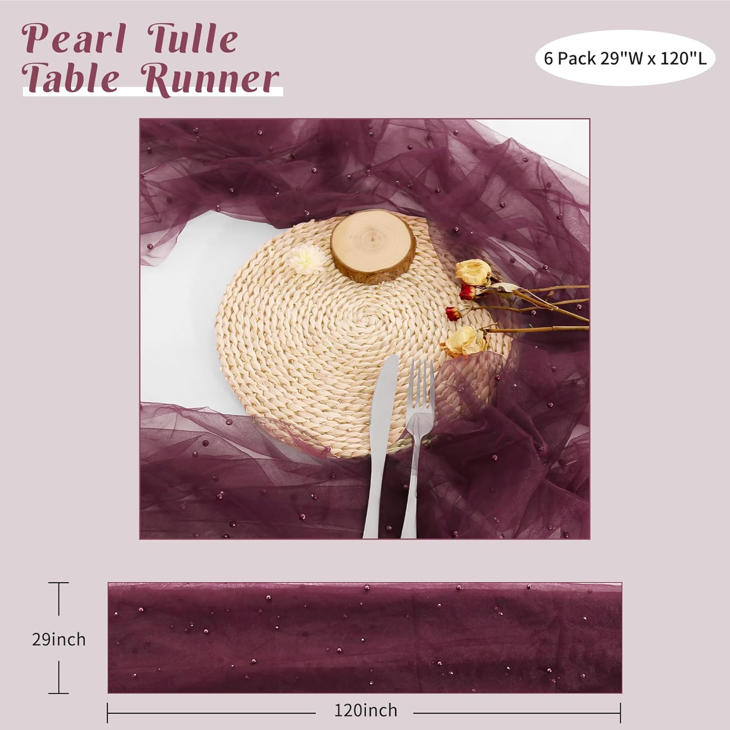 Set of 6 Pearl Table Runner 29 x 120 Inch Tulle Fabric Lace Table Runners Boho Rustic Tablecloth for Bridal Shower Birthday Party Wedding Arch Aisle Veil Dessert Table Decor(Burgundy)