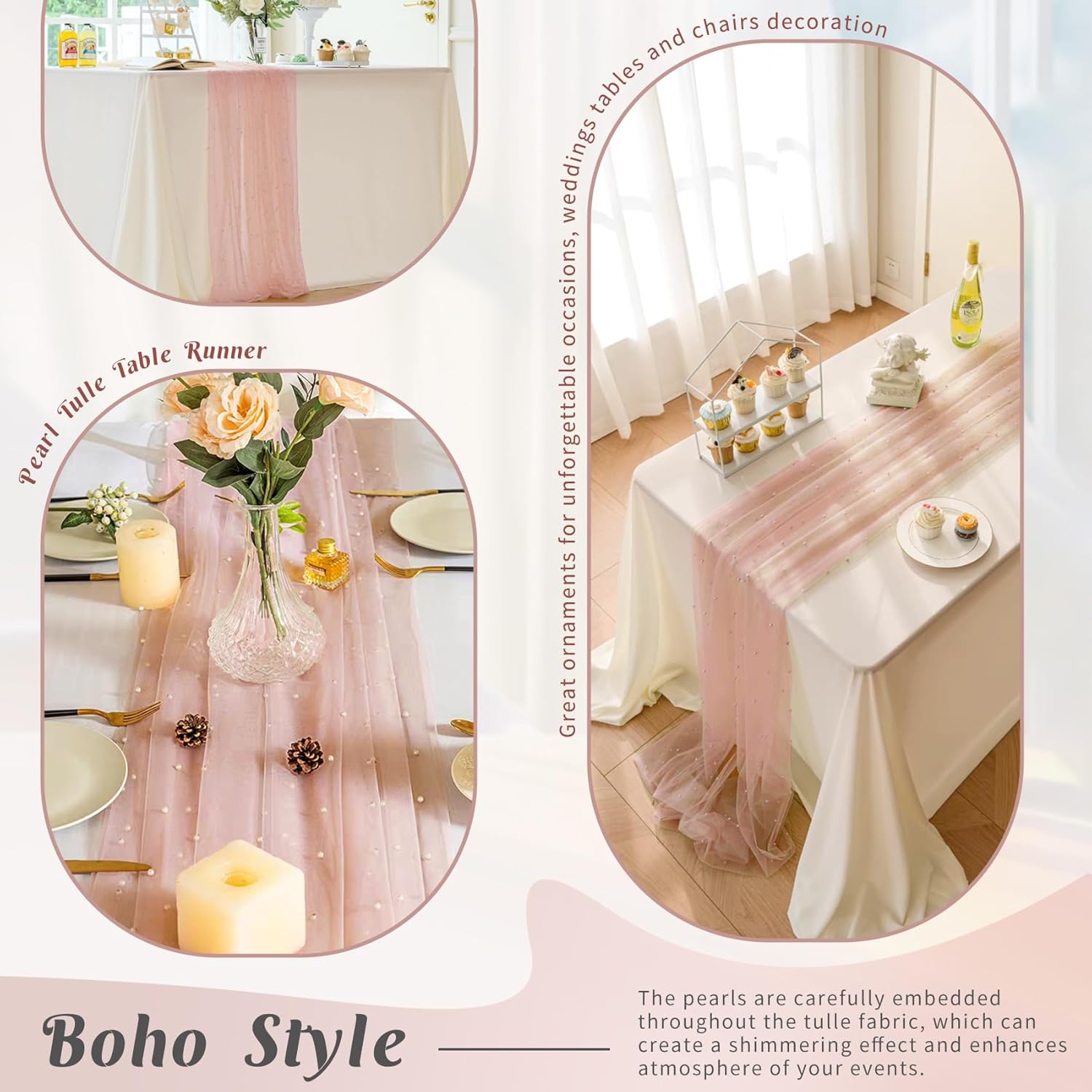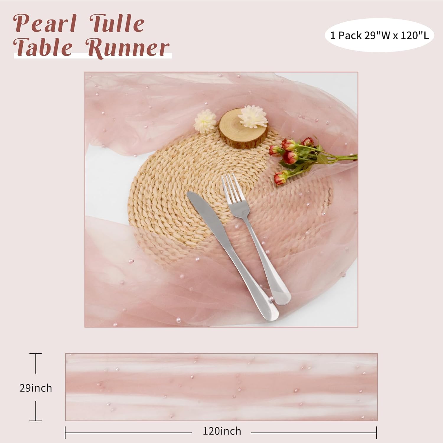 Pearl Table Runner 29 x 120 Inch Tulle Fabric Lace Table Runners Boho Rustic Tablecloth for Bridal Shower Birthday Party Wedding Arch Aisle Veil Dessert Table Decor(1 Pack, Dusty Pink)
