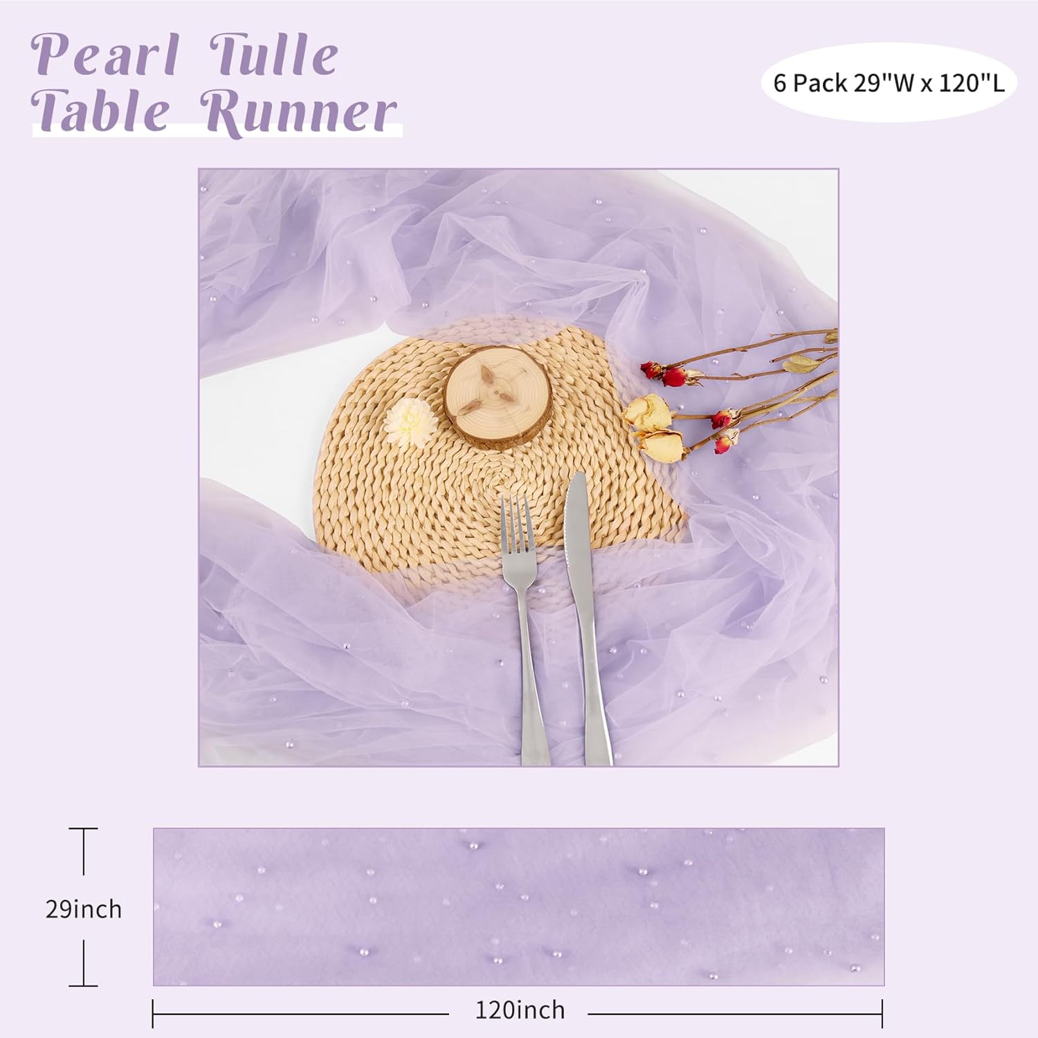 Set of 6 Pearl Table Runner 29 x 120 Inch Tulle Fabric Lace Table Runners Boho Rustic Tablecloth for Bridal Shower Birthday Party Wedding Arch Aisle Veil Dessert Table Decor(Light Purple)