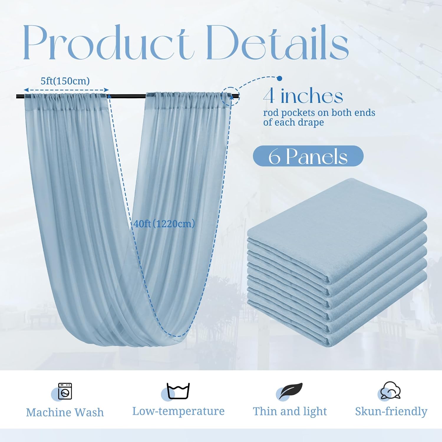 • 【Package Includes】The package will include 6 panels Dusty Blue wedding ceiling drapes (Not include stand), each wedding extra long curtain measures 5 feet (60inch)wide x 40 feet(480inch) long.The sufficient quantity can meet your demands for decorating your weddings, parties, receptions.