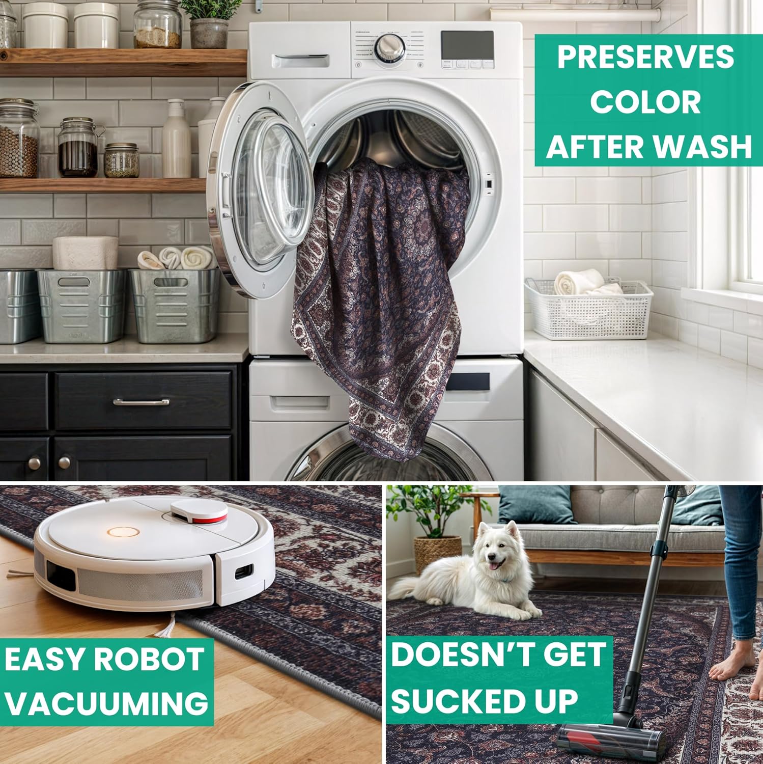 • MACHINE WASHABLE: Machine wash on delicate cycle (do not use bleach) at 85°F (30°C) and line dry or dry on air-only cycle without heat. Vacuum regularly and spot clean small stains. This easy to clean rug is perfect for families with kids and pets, and for high traffic areas.