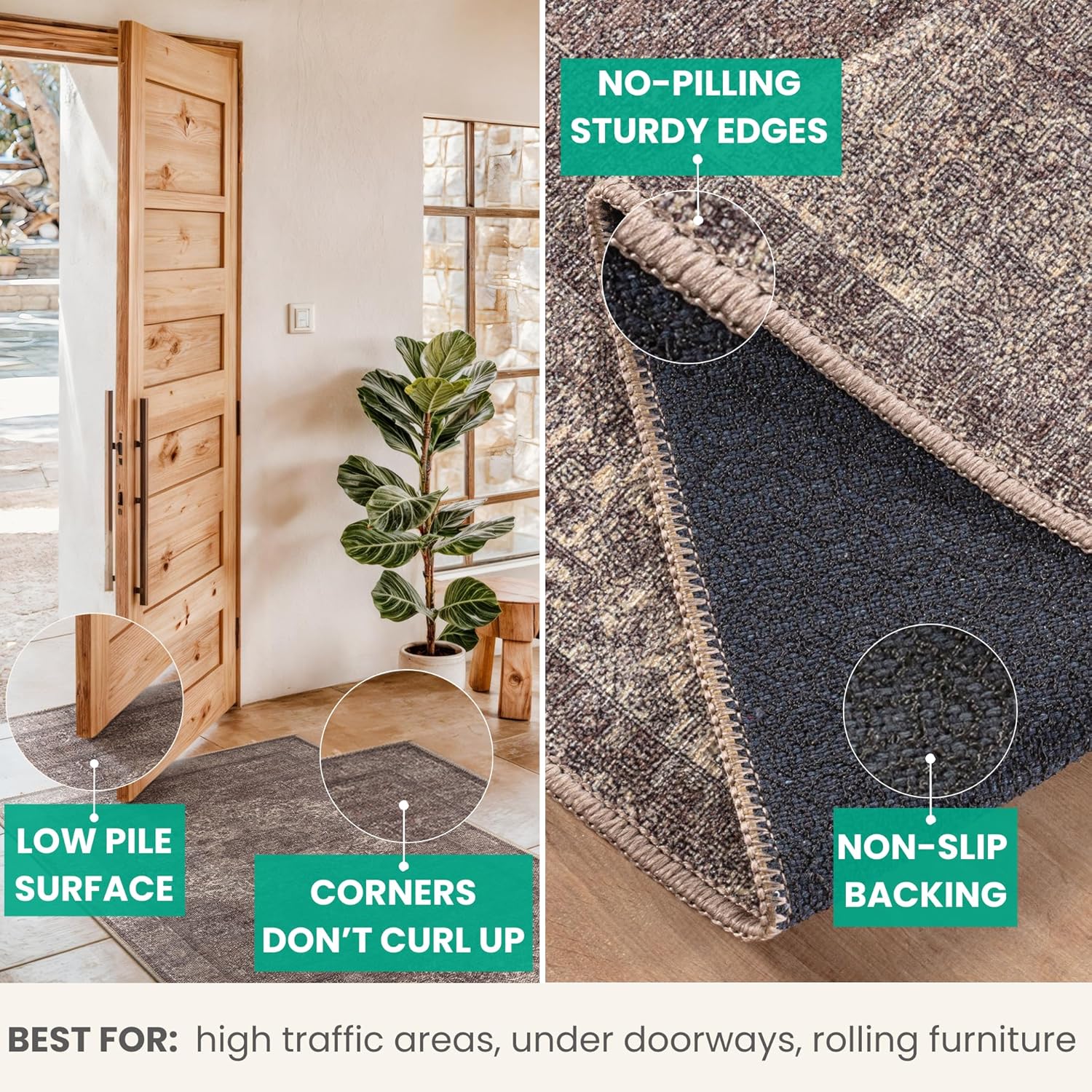 • EASY TO SETUP AND NON-SLIP: This one-piece machine washable rug with non-slip backing attached eliminates any additional setup. Simply unfold and lay flat upon arrival in the desired space. Non-slip backing prevents the rug from moving or sliding without the need for additional rug pad or grippers.