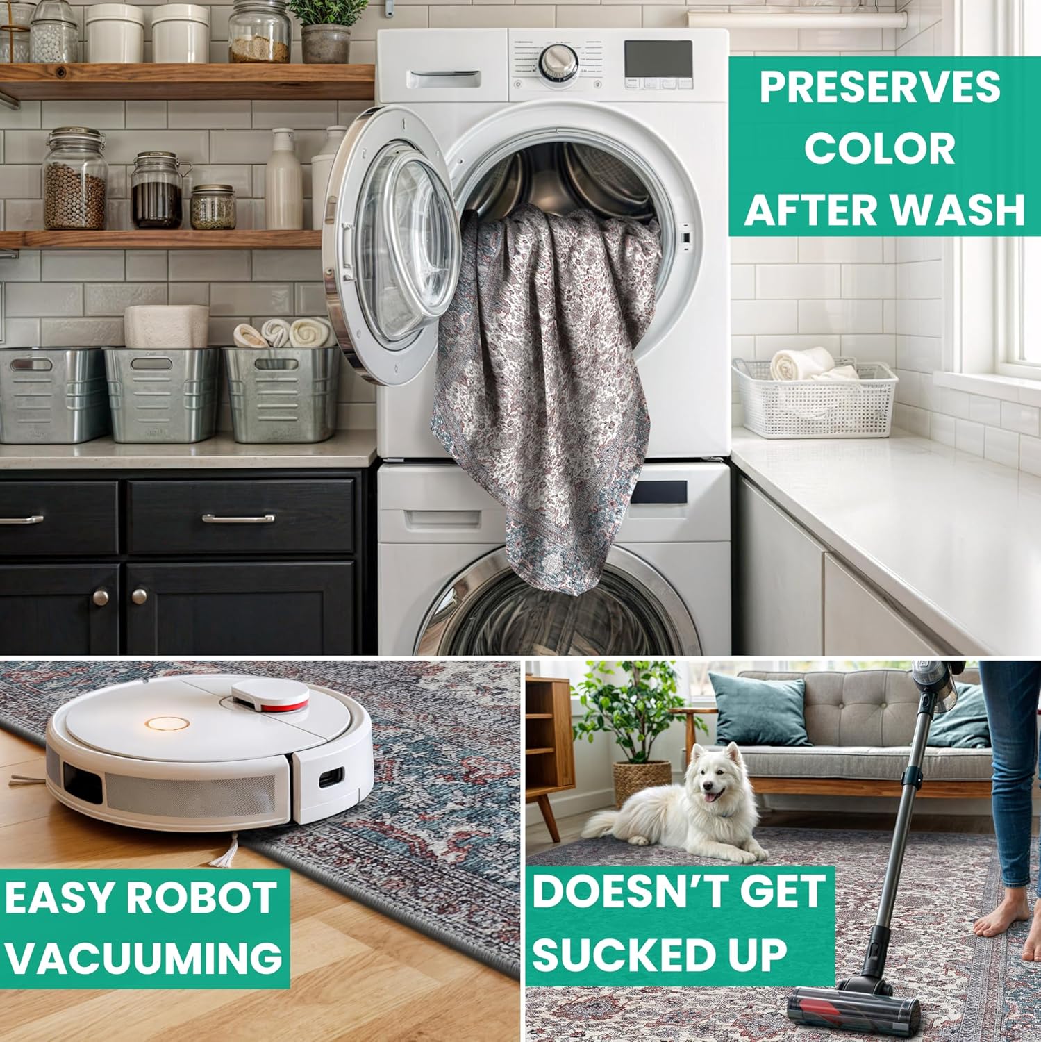 • MACHINE WASHABLE: Machine wash on delicate cycle (do not use bleach) at 85°F (30°C) and line dry or dry on air-only cycle without heat. Vacuum regularly and spot clean small stains. This easy to clean rug is perfect for families with kids and pets, and for high traffic areas.