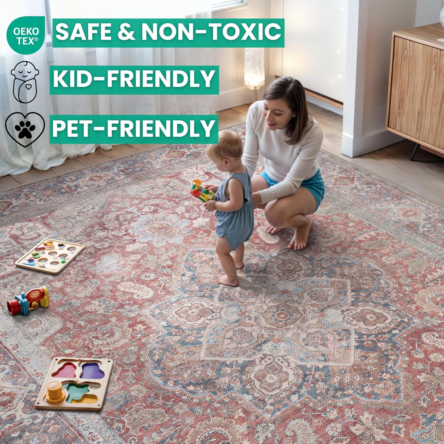 • MACHINE WASHABLE: Machine wash on delicate cycle (do not use bleach) at 85°F (30°C) and line dry or dry on air-only cycle without heat. Vacuum regularly and spot clean small stains. This easy to clean rug is perfect for families with kids and pets, and for high traffic areas.
