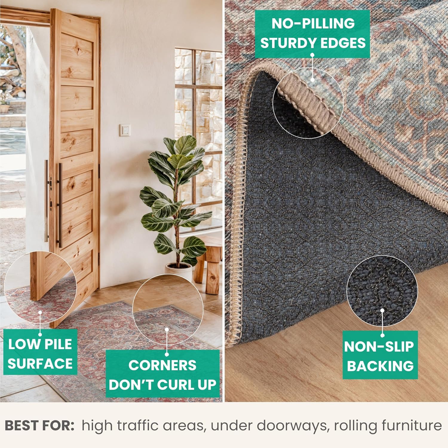 • EASY TO SETUP AND NON-SLIP: This one-piece machine washable rug with non-slip backing attached eliminates any additional setup. Simply unfold and lay flat upon arrival in the desired space. Non-slip backing prevents the rug from moving or sliding without the need for additional rug pad or grippers.