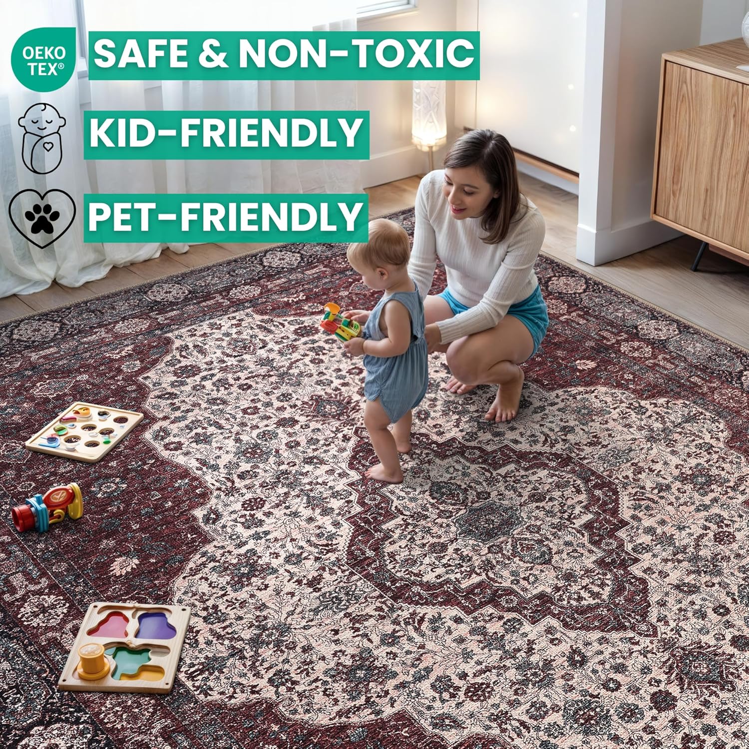 Bloom Rugs Washable Non-Slip 6' x 9' Rug - Red/Green/Cream Traditional Medallion Area Rug for Living Room, Bedroom, Dining Room, and Kitchen - Exact Size: 6' x 9'