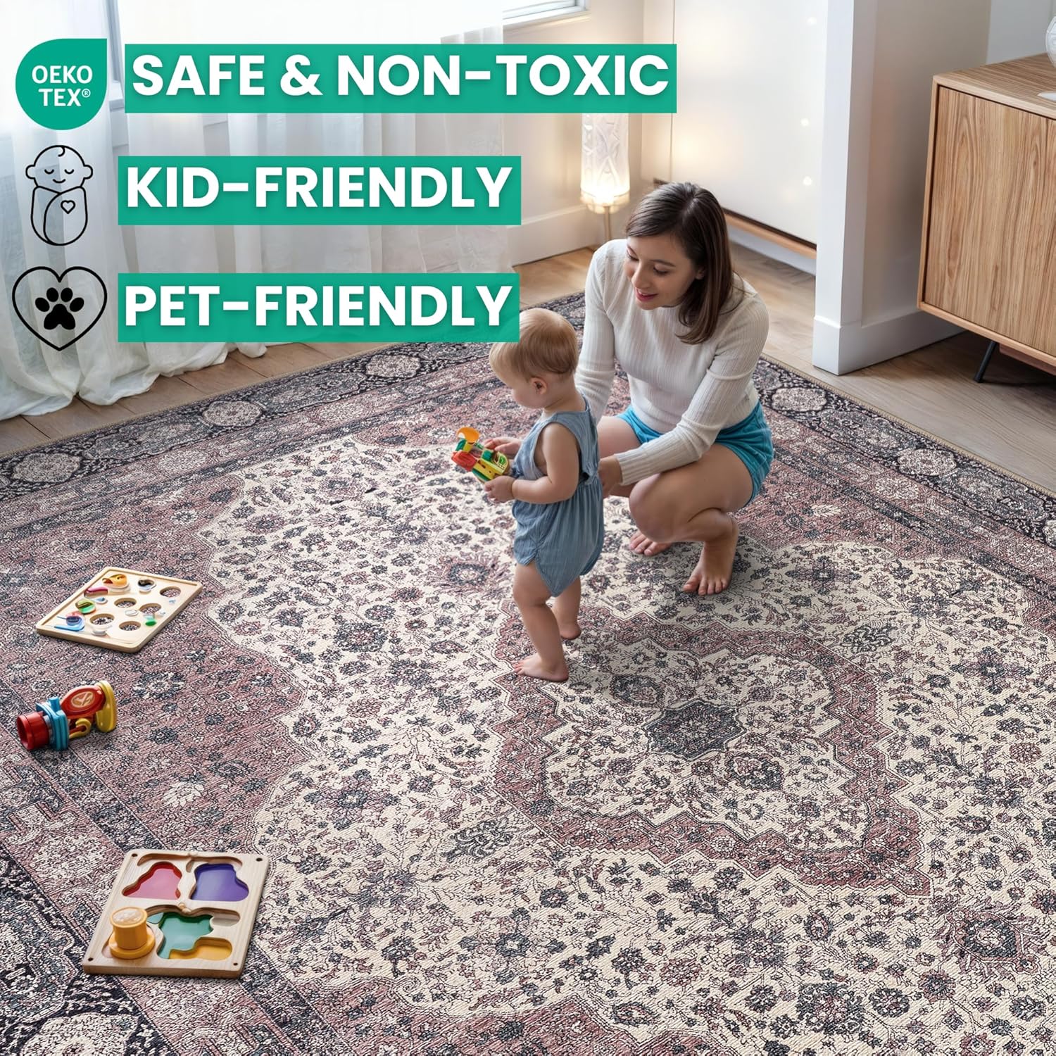 • MACHINE WASHABLE: Machine wash on delicate cycle (do not use bleach) at 85°F (30°C) and line dry or dry on air-only cycle without heat. Vacuum regularly and spot clean small stains. This easy to clean rug is perfect for families with kids and pets, and for high traffic areas.