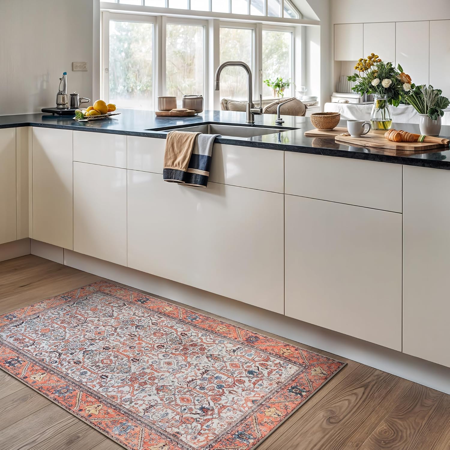 • EASY TO SETUP AND NON-SLIP: This one-piece machine washable rug with non-slip backing attached eliminates any additional setup. Simply unfold and lay flat upon arrival in the desired space. Non-slip backing prevents the rug from moving or sliding without the need for additional rug pad or grippers.