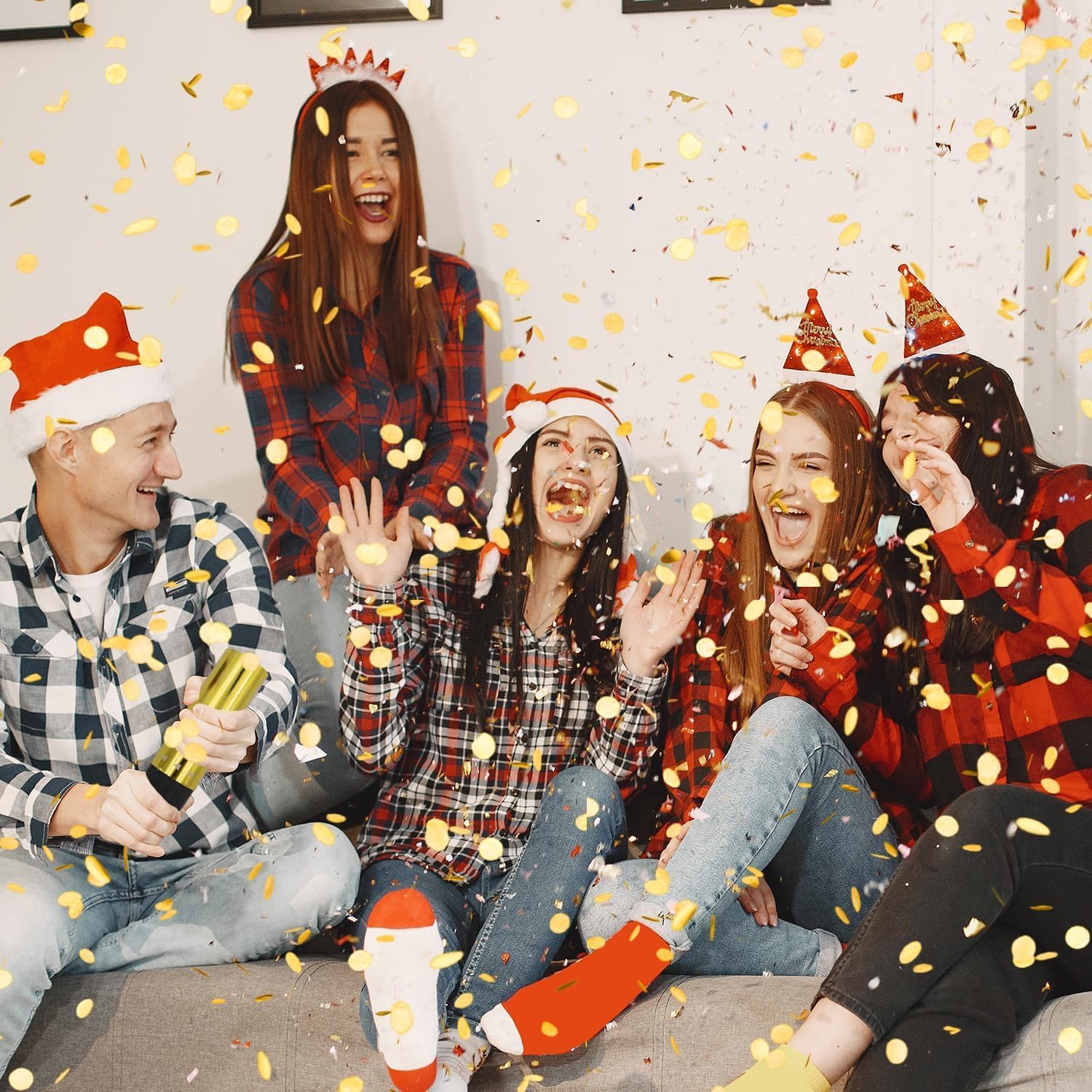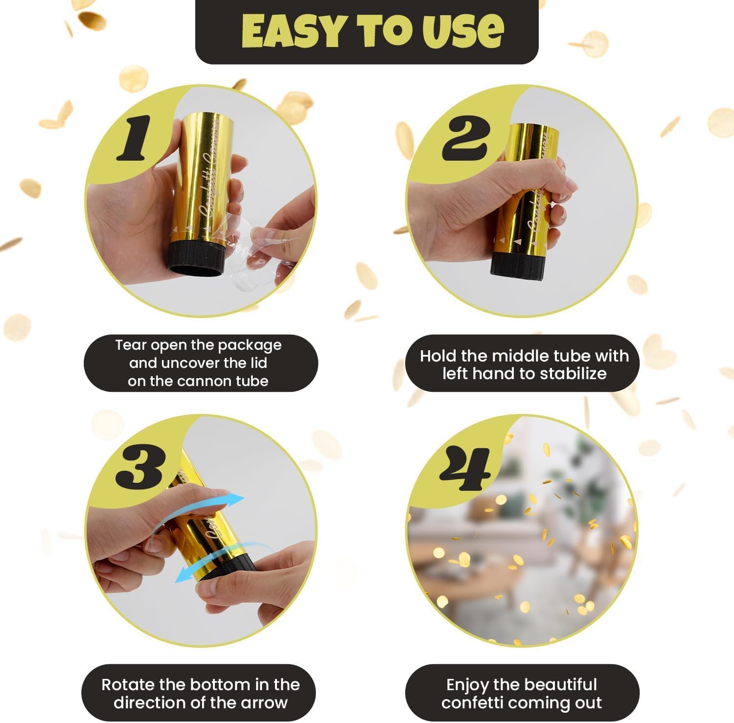 • 【Safe & Easy to Use】Our mini golden confetti cannon kit contains gold foil confetti are non-toxic. Small party poppers confetti shooters work well indoors and outdoors easy to clean and 100% safety, you and your guests can enjoy confetti cannon for your celebrations party.Just give each confetti cannon a hard twist and let the magic happen!