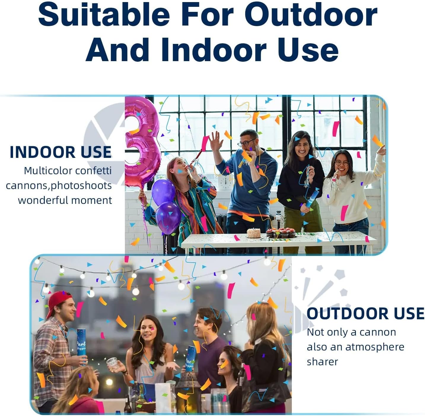 • WARM TIPS - Confetti cannon can fly at a height of 10-15 feet.To avoid accidental injury,confetti poppers should be shot into the sky when in use,and don't aim at people or faces.If you have any dissatisfaction with our confetti poppers gun,feel free to contact us.We provide high-quality products and 24-hour after-sales service