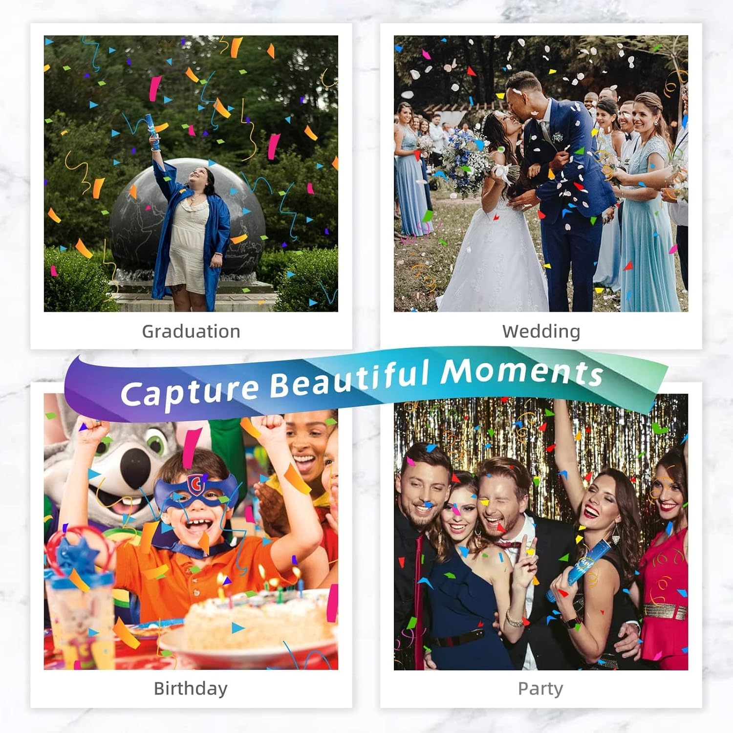 • CONFETTI POPPERS,PERFECT FOR ANY EVENT - Confetti cannon biodegradable suitable for Graduation,Wedding Celebration,Birthday, Christmas Eve and New Year Celebration or other celebrations.At every wonderful moment,our confetti cannon are a good atmosphere,the biodegradable multicolor confetti poppers sprayed in the air will create a visual feast