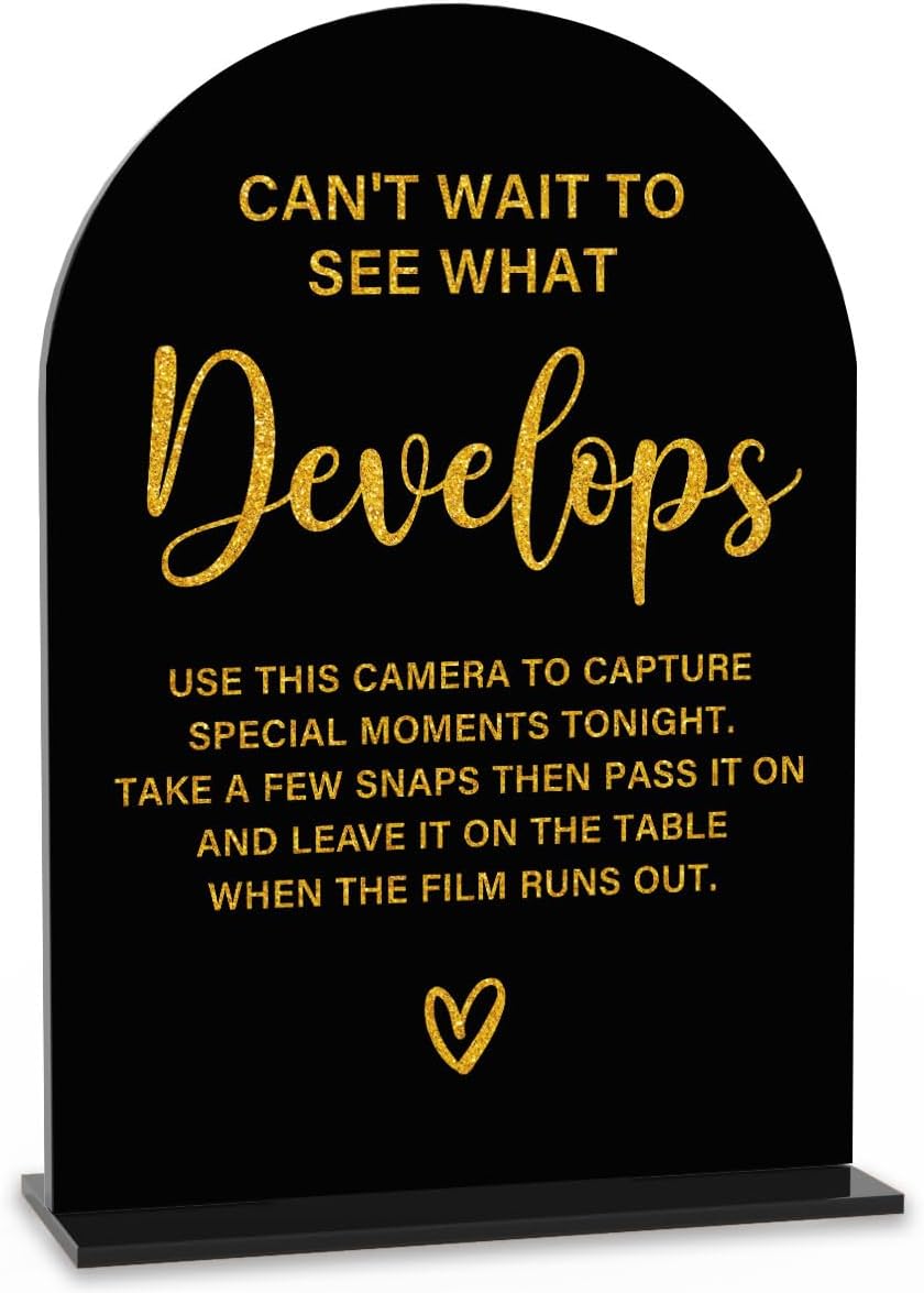 Acrylic Wedding Sign, Bridal Shower Decorations, Can't Wait to See What Develops Sign for Ceremony, Modern Font Table Signs, Acrylic Table Top Signs for Wedding Reception (Black Gold)