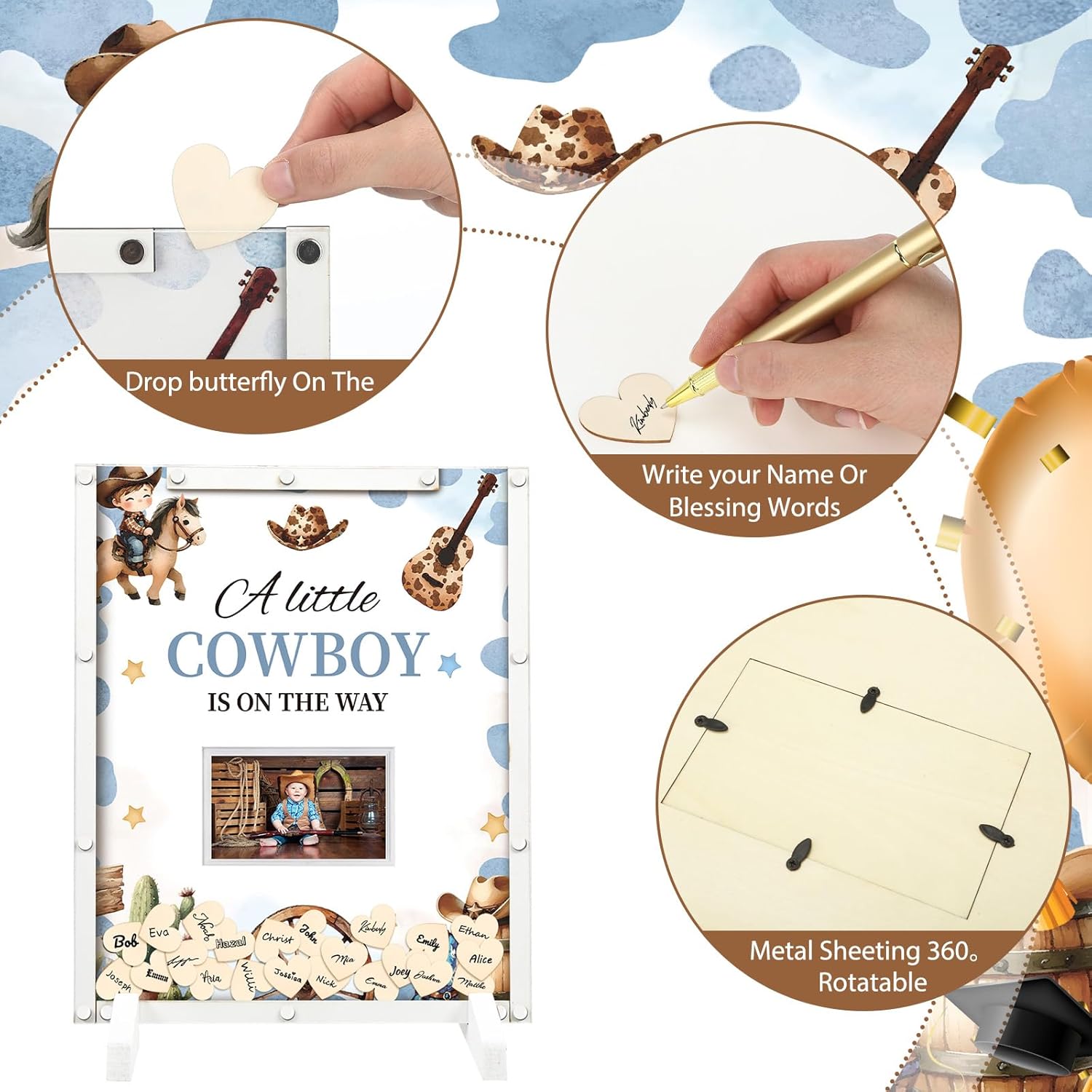 65 Pcs Cowboy Baby Shower Decorations Guest Book Alternatives a Little Cowboy is on The Way Decorations Western Baby Shower Party Supplies Sign in Guest Book with Picture Frame and 60 Wooden Chip