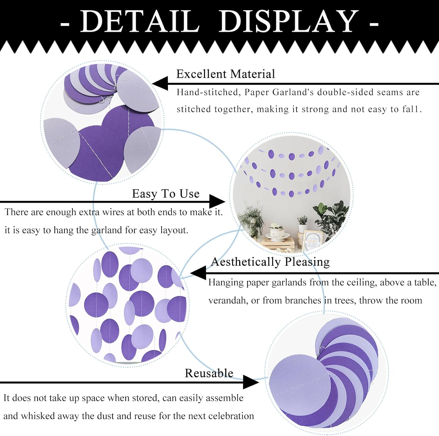 • HOW IT'S MADE - MerryNine Paper Garland is made of high quality double sided gold gittler paper and card stock circle polka dots that is sewn together with double sturdy thread, each thread is sewn with 40pcs dots, each end has plenty of extra thread to makes it easy to hang the garland
